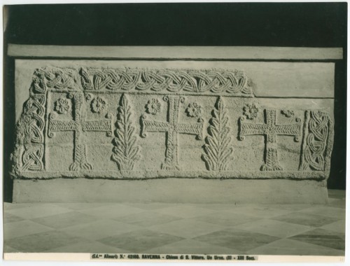 - ISCRIZIONI supporto primario: recto: in basso - (Ed.ne Alinari) N.° 42160. RAVENNA - Chiesa di S. Vittore. Un urna (XI-XIII Sec). - a matita -