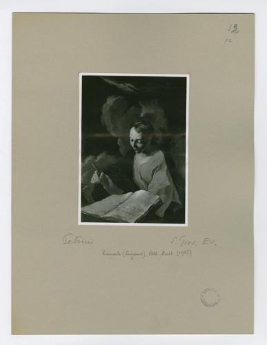 - NOTIZIE STORICO CRITICHE La fotografia, che riproduce San Giovanni Evangelista dipinto da Giuseppe Antonio Petrini (1677-1759), fa parte dell'insieme archivistico denominato "Collezione Züst" (due cartelle: C. XI e C. XII), nello specifico, è conservata all'interno della cartella C. XI. Trattasi del frutto dello studio condotto da Antonio Morassi sulla collezione di Giovanni Züst nel 1957. La fotografia è montata su cartoncino.