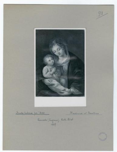 - NOTIZIE STORICO CRITICHE La fotografia, che riproduce la Madonna con il Bambino di Scuola tedesca d'inizio Ottocento, fa parte dell'insieme archivistico denominato "Collezione Züst" (due cartelle: C. XI e C. XII), nello specifico, è conservata all'interno della cartella C. XII. Trattasi del frutto dello studio condotto da Antonio Morassi sulla collezione di Giovanni Züst nel 1957. La fotografia è montata su cartoncino.
