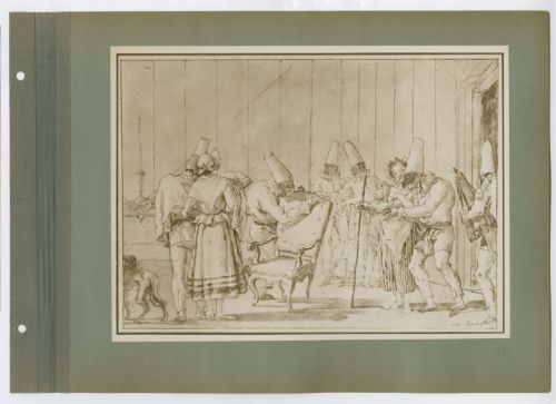 G.D. Tiepolo. Un anziano Pulcinella viene aiutato a sedersi