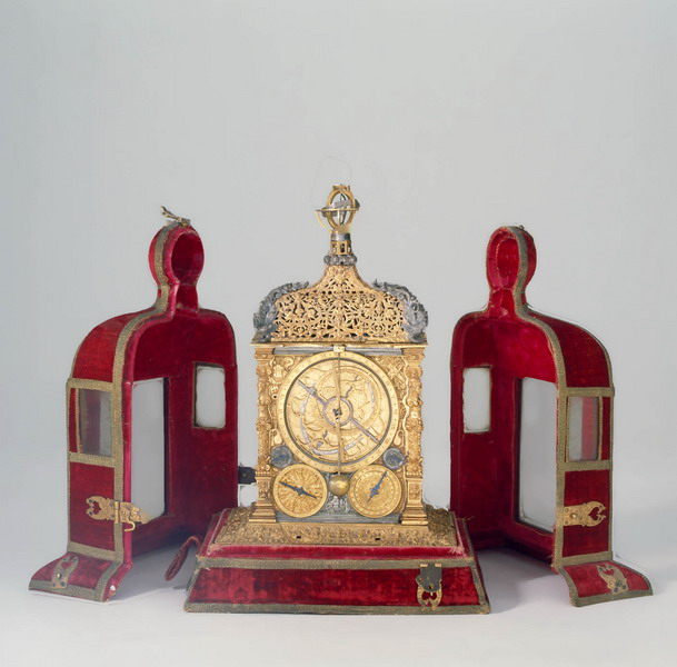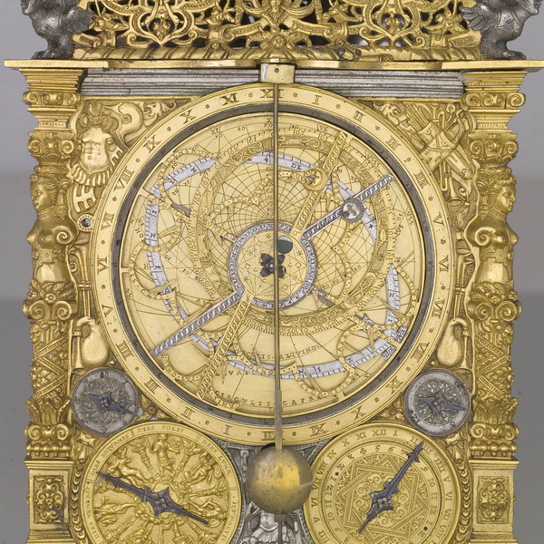 La cassa è in ottone dorato a forma di edicola posta su una base con bordo a scivolo. I quadranti si trovano sulle quattro facce ed una cupola in ottone dorato e traforato è sormontata da una sfera armillare. La sezione ai piedi dei pilastri d'angolo misura 157x95 mm. La decorazione è ricchissima, elaborata con cariatidi, figure simboliche virili e muliebri, animali, chimere, mascheroni, elmi, armature, alabarde, mazze, trofei, ruote di carro da guerra, trombe, tamburi, zampogne, frutta e fronde. I quadranti sono su tutte le facce: su una delle principali sono disposti simmetricamente cinque quadranti: in alto quello di maggior diametro, sotto ve ne sono due di piccolo diametro e, più sotto, due di diametro intermedio. Il quadrante maggiore è astrolabico, con cerchio orario esterno numerato da I a XII due volte, con anello a frizione numerato da 1 a 24 e mosso manualmente per indicare le ore all'italiana, rete rotante in un giorno siderale, e, sopra la rete, gli indici del sole e della luna. I due dischi al centro, che portano questi indici, ruotano a velocità diverse e mostrano l'età e le fasi della luna, nonché trini, quartili e sestili. Sotto la rete è posto l'indice dei nodi lunari, in forma di drago. Il timpano rovesciabile reca sulle due superfici il tracciato per individuare la posizione delle stelle e per conoscere le ore planetarie ed è predisposto da una parte per una latitudine di 48° e dall'altra per quella di 40°. Dei due quadranti più piccoli quello di sinistra è per la regolazione della marcia mediante setola di porco, quello di destra per la scelta della suoneria delle ore secondo i computi in 24, in 12 e in 6. Degli altri due quadranti, quello di sinistra è per l'indicazione dei giorni della settimana con i loro nomi in latino; quello di destra serviva per puntare la sveglia mancante. Sull'altra faccia principale sono disposti quattro quadranti. Altri due dischi ruotano indicando la durata dei periodi di luce e di oscurità ed i momenti dell'alba del tramonto. L'anello solidale al disco brunito indica le ore da 1 a 24 secondo il computo italiano, il disco più piccolo al centro indica le ore da 1 a 24 secondo il computo babilonese. Le superfici che si intersecano sono numerate per indicare le ore secondo il computo di Norimberga. Il quadrante in basso a destra indica la data e la latitudine volute ed il cammino del Sole lungo l'eclittica. Intorno al quadrante minore a sinistra si trova una iscrizione. I quadranti sulle due facce laterali servono per la messa in funzione della suoneria. Sotto la cupola appositamente traforata si trovano tre ruote concentriche con diverse tacche per computi in 6, 12, 24.