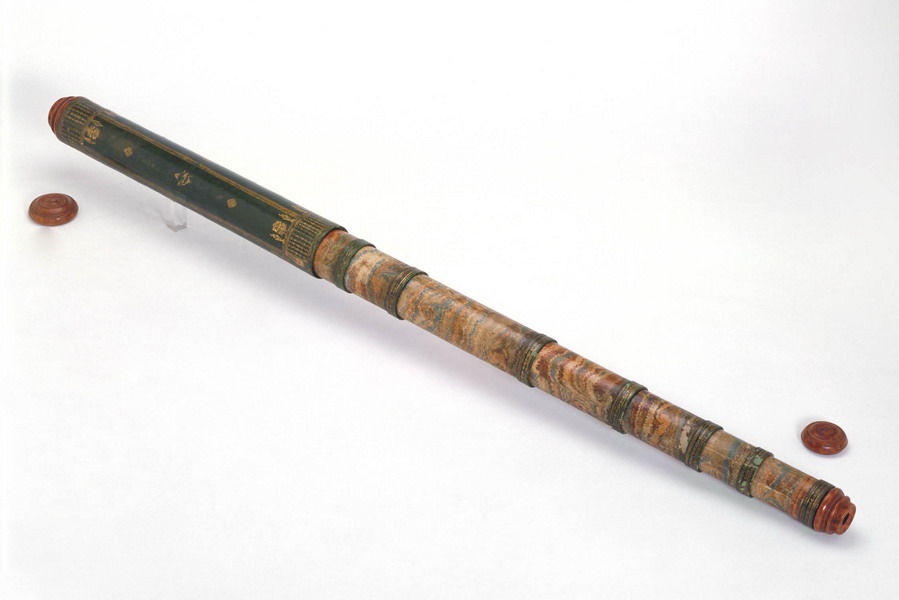 Telescopio terrestre costituito da un tubo principale e sette tiretti. All'estremità del tubo principale, rivestito di pelle verde con fregi dorati, è collocata la lente obiettiva biconvessa di 47 mm di diametro. La lente è firmata dall'autore (Giuseppe Campani) e inserita in una montatura di legno di bosso. I tiretti sono rivestiti di carta fiorentina rossastra; alcuni presentano all'interno diaframmi. Il tiretto più piccolo reca il porta-oculare. Nel suo interno si inserisce il cosiddetto "gruppo erettore", caratteristico dei telescopi di Campani che contiene due lenti biconvesse; la grandezza e la luminosità degli oggetti e/o l'ingrandimento, dipendono dal verso in cui l'erettore è inserito nel settimo tiretto. La seconda parte contiene un diaframma e l'oculare ha una lunghezza focale di 58,4 mm. Questo strumento ha un ingrandimento di circa 30 volte.