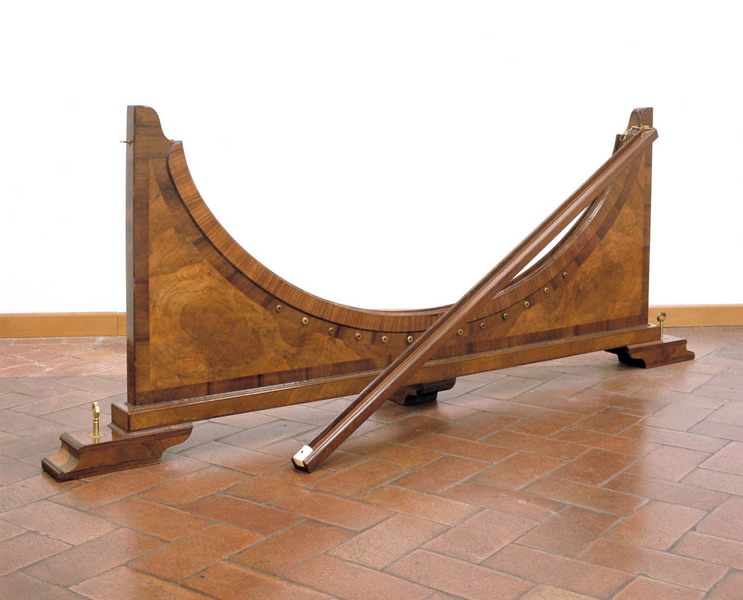 - NOTIZIE STORICO CRITICHE Questo apparecchio dimostra gli effetti osservabili di un principio fisico scoperto e comunicato a Guidobaldo del Monte da Galileo il 29 novembre 1602. Galileo dimostrò con metodi geometrici che un grave impiega minor tempo a discendere lungo l'arco di una circonferenza che non lungo la corda corrispondente (nonostante quest'ultima sia più breve). Galileo, che considerava l'arco come equivalente a un insieme infinito di piani inclinati, non si rese tuttavia conto che il percorso brachistocrono di un grave che scende tra due punti non è l'arco di cerchio ma di cicloide. Il matematico Jakob (o Jacques) Bernoulli (1654-1705) nel 1697 dimostrò un'altra importante proprietà della cicloide. Bernoulli mostrò che la discesa di un grave lungo l'arco della circonferenza avviene in un tempo minore della discesa lungo la corda corrispondente. Sebbene abbastanza laboriosa, la dimostrazione di Bernoulli segnava un considerevole progresso nello sviluppo del calcolo delle variazioni. Strumenti simili, continuarono a essere costruiti per tutto il XIX secolo, consentendo ancora esaurienti dimostrazioni. In aggiunta a quelli cicloidale e rettilineo, questi apparecchi recano un terzo canale a forma di arco di circonferenza. Non si conoscono informazioni sul costruttore dello strumento, lo stipettaio Francesco Spighi, eccetto che fu assunto per un periodo come artigiano e ebanista dal Regio Museo di Fisica e Storia Naturale. Alcuni dettagli di stile e costruzione suggeriscono che Spighi abbia anche costruito altri strumenti di meccanica.