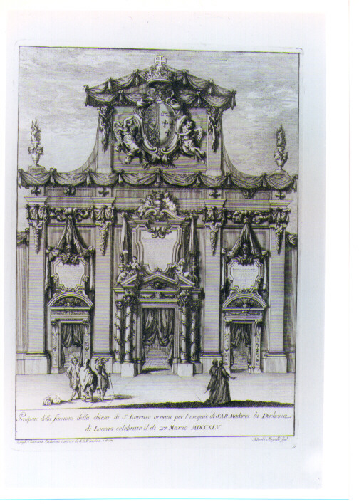 VEDUTA DELLA FACCIATA DELLA CHIESA DI SAN LORENZO CON APPARATO FUNEBRE (stampa) di Chamant Joseph, Mogalli Niccolò (sec. XVIII)