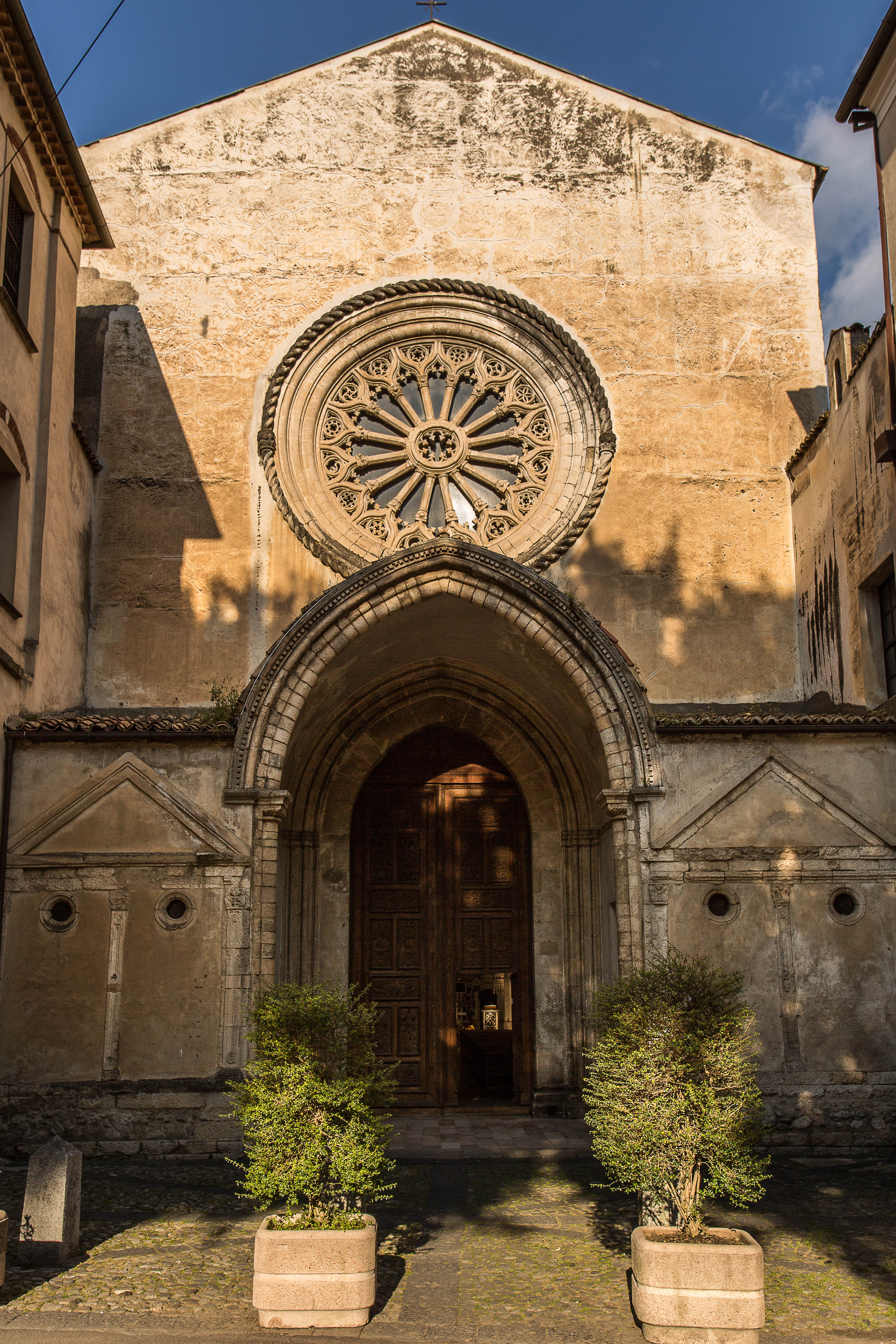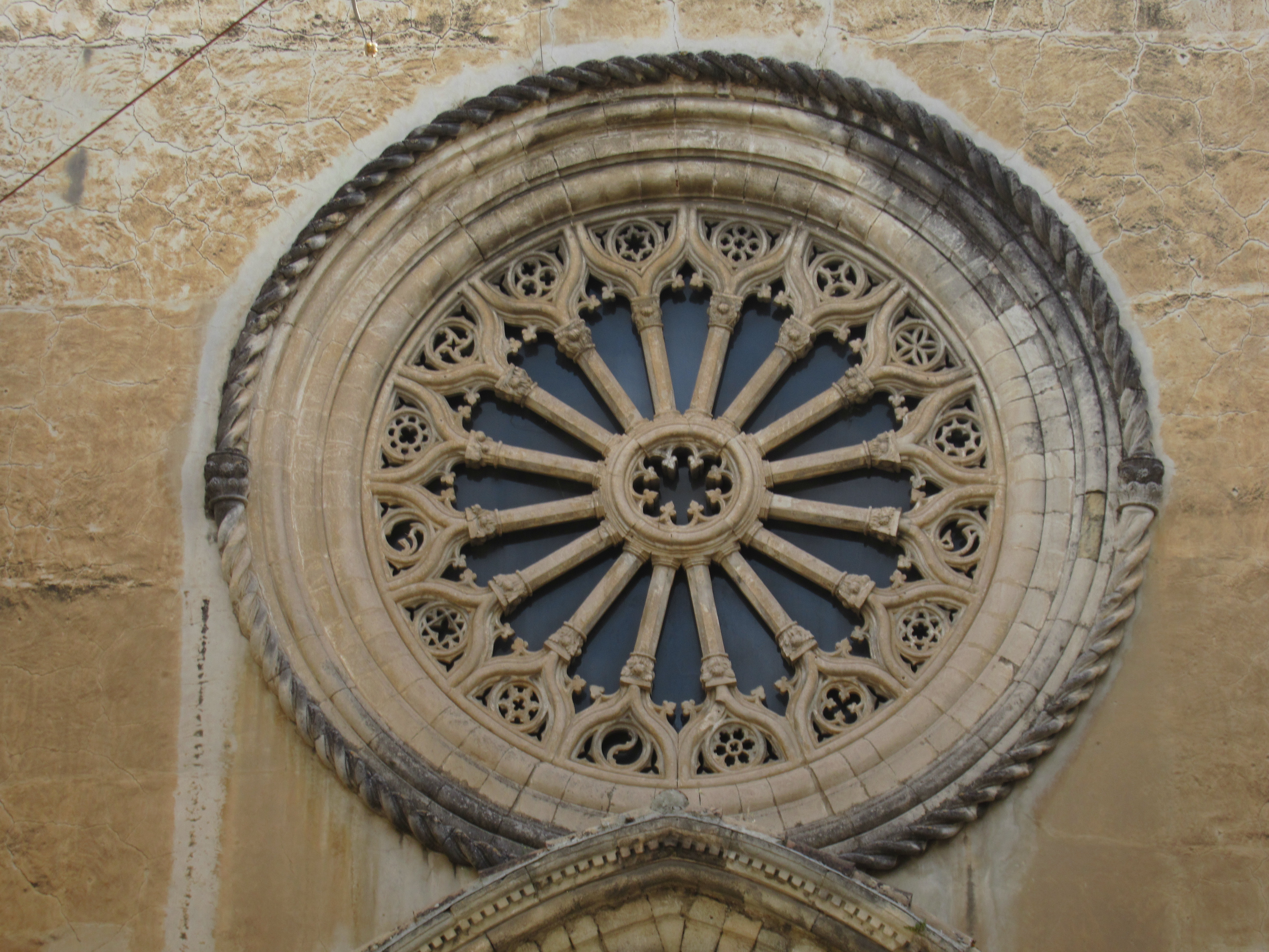 Di particolare bellezza è la facciata di accesso all’edificio, che conserva ancora numerosi elementi architettonici originari. Tra questi, vi è il maestoso rosone, caratterizzato dalla presenza di sedici colonnine tortili che decorano e armonizzano la facciata. Il portale di accesso – ogivale, realizzato in legno e risalente al 1612 – è racchiuso all’interno di un protiro in stile gotico di eccezionale splendore. Il portale ligneo è completamente intagliato: decorazioni floreali si avvicendano a busti di santi domenicani.