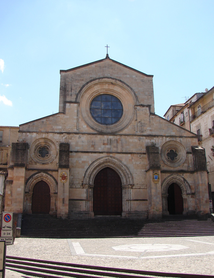 L’edificio sorge sicuramente sui resti di una chiesa di origini più antiche, probabilmente danneggiata a causa di un terremoto. La facciata a salienti, è caratterizzata dalla presenza di tre imponenti portali di accesso, su cui si trovano tre rosoni. L’interno è scandito da una divisione in tre navate e vi sono edificate alcune importanti cappelle, come quella dedicata alla Madonna del Pilerio: qui, è custodita un’icona risalente al XII secolo di origine bizantina che ritrae la Vergine mentre allatta il Bambino.