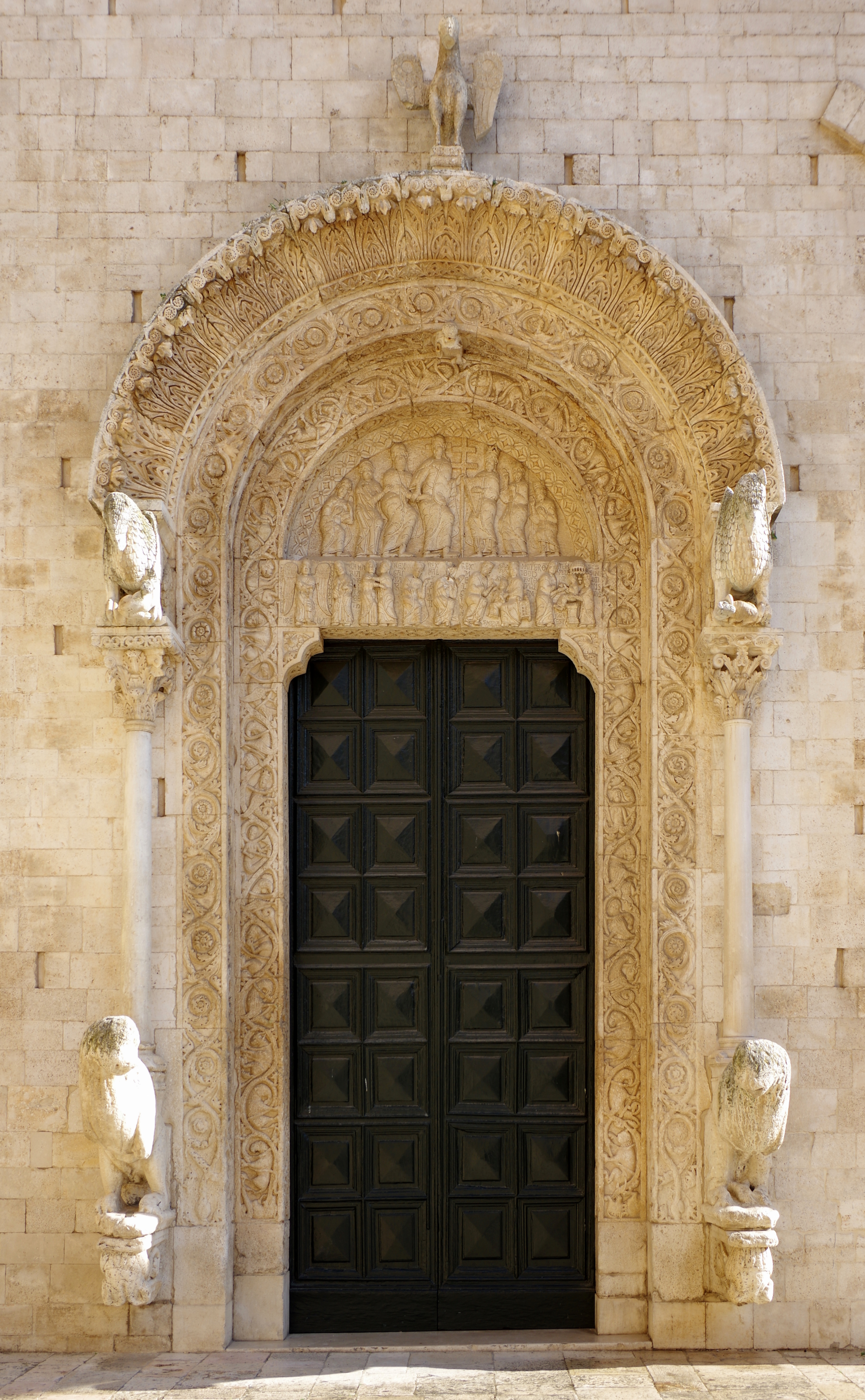La facciata, a salienti e tripartita, è scandita da tre portali di accesso. Il portale maggiore è sfarzosamente decorato: leoni stilofori sui quali si elevano degli ippogrifi sostengono l’archivolto, che è completamente decorato con elementi vegetali e animali. Al culmine dell’arco, vi è la statua di un pellicano; scelto fin dall’antichità come simbolo dell’eucaristia in quanto è disposto a squarciarsi il petto a costo di nutrire i propri figli con il suo sangue. Infine, sia la lunetta che l’architrave al di sopra del portale principale, sono scolpiti a bassorilievo con scene della vita di Gesù e l’Anastasis – ossia la resurrezione e la discesa negli Inferi, realizzate da maestranze locali.