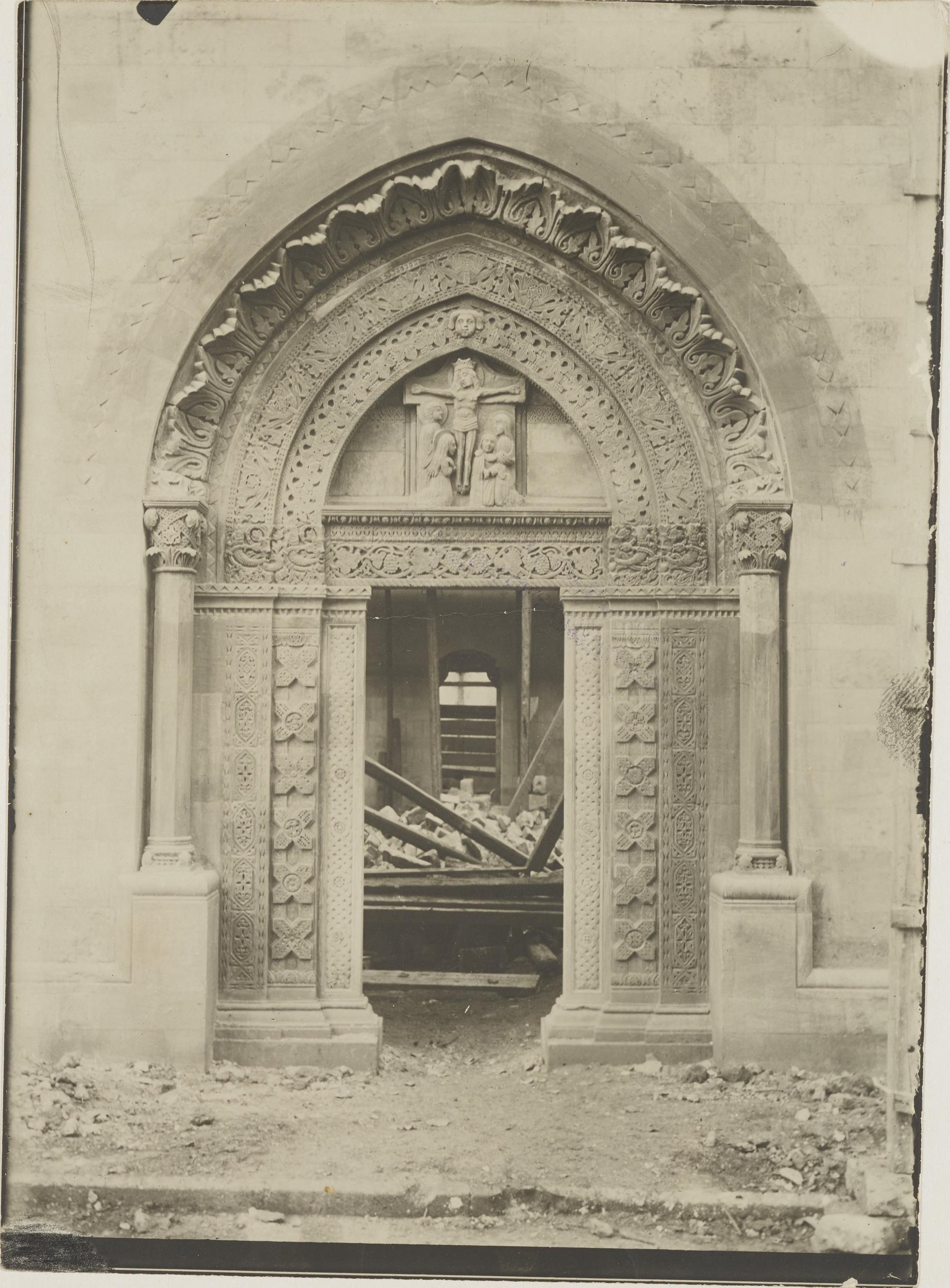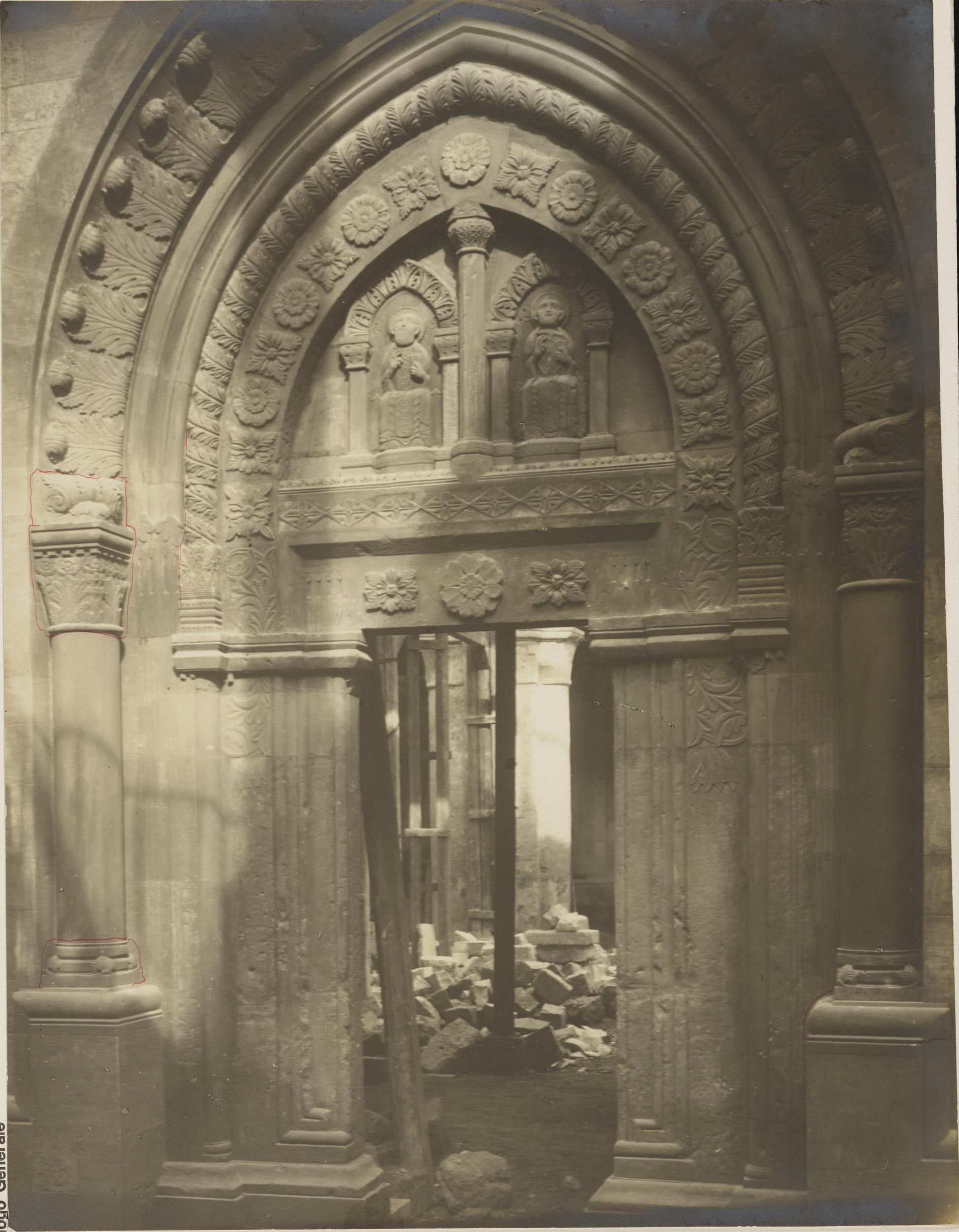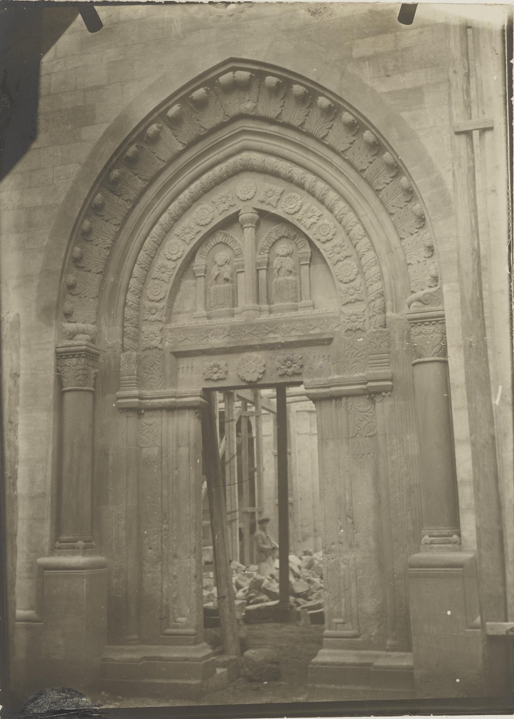 Fotografo non identificato, Conversano - Cattedrale, portale laterale, scorcio durante i restauri del 1914, 1901-1925, gelatina ai sali d'argento/carta, MPI155325