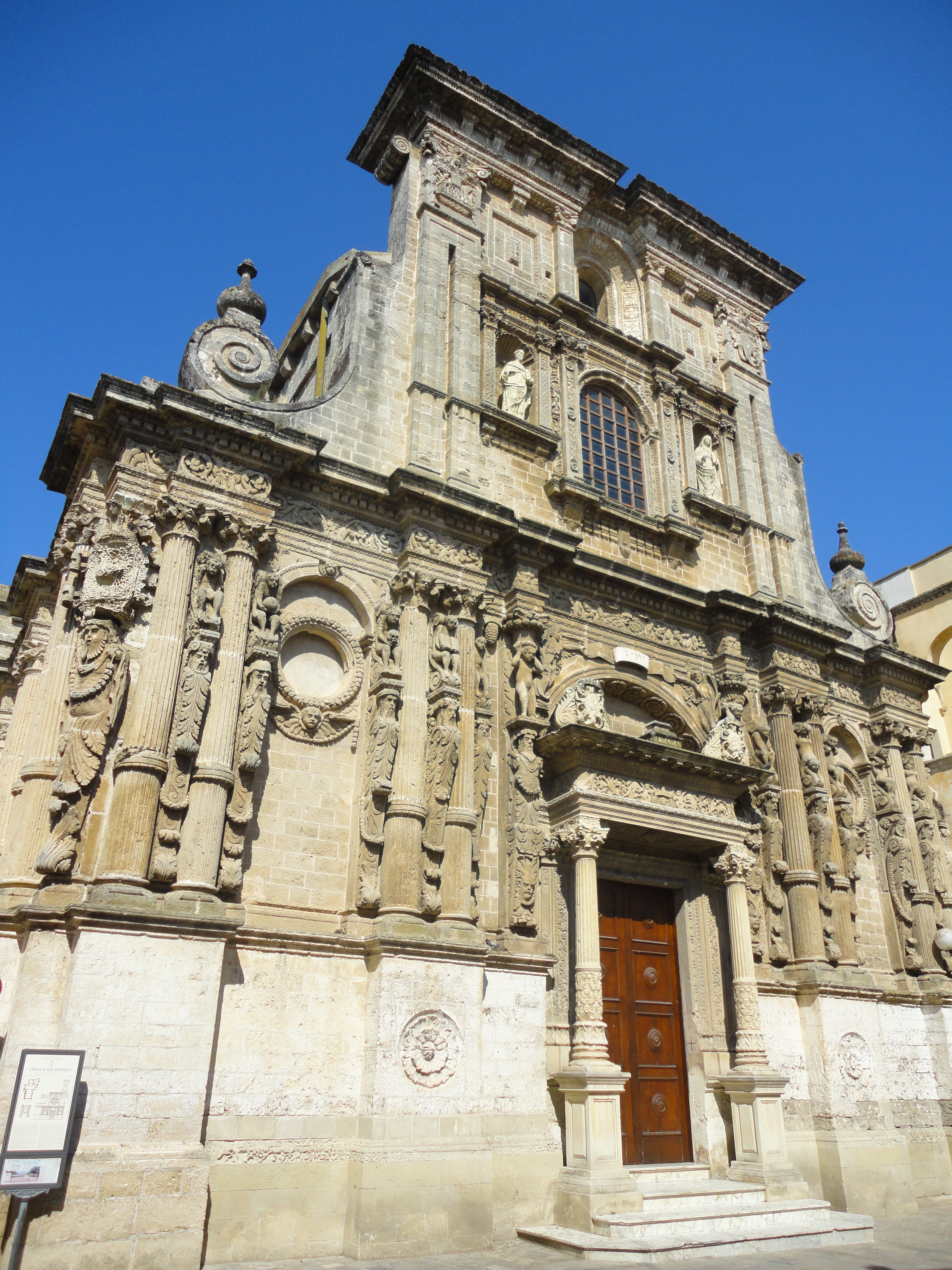 La facciata, in pietra leccese, presenta una parte inferiore ricca di figure umane e cariatidi addossate le une alle altre. L’iconografia straordinaria di queste decorazioni, pur attingendo al repertorio tardo-antico e basso-medievale, è difficile riferire a precedenti modelli. La parte superiore della facciata presenta invece forme più leggere. Tale differenziazione tra le due zone della facciata richiama la visione dell’inferno e del paradiso, il trionfo del Cristianesimo sui miti pagani, espresso dalla maestosa decorazione del prospetto della Basilica di Santa Croce a Lecce.