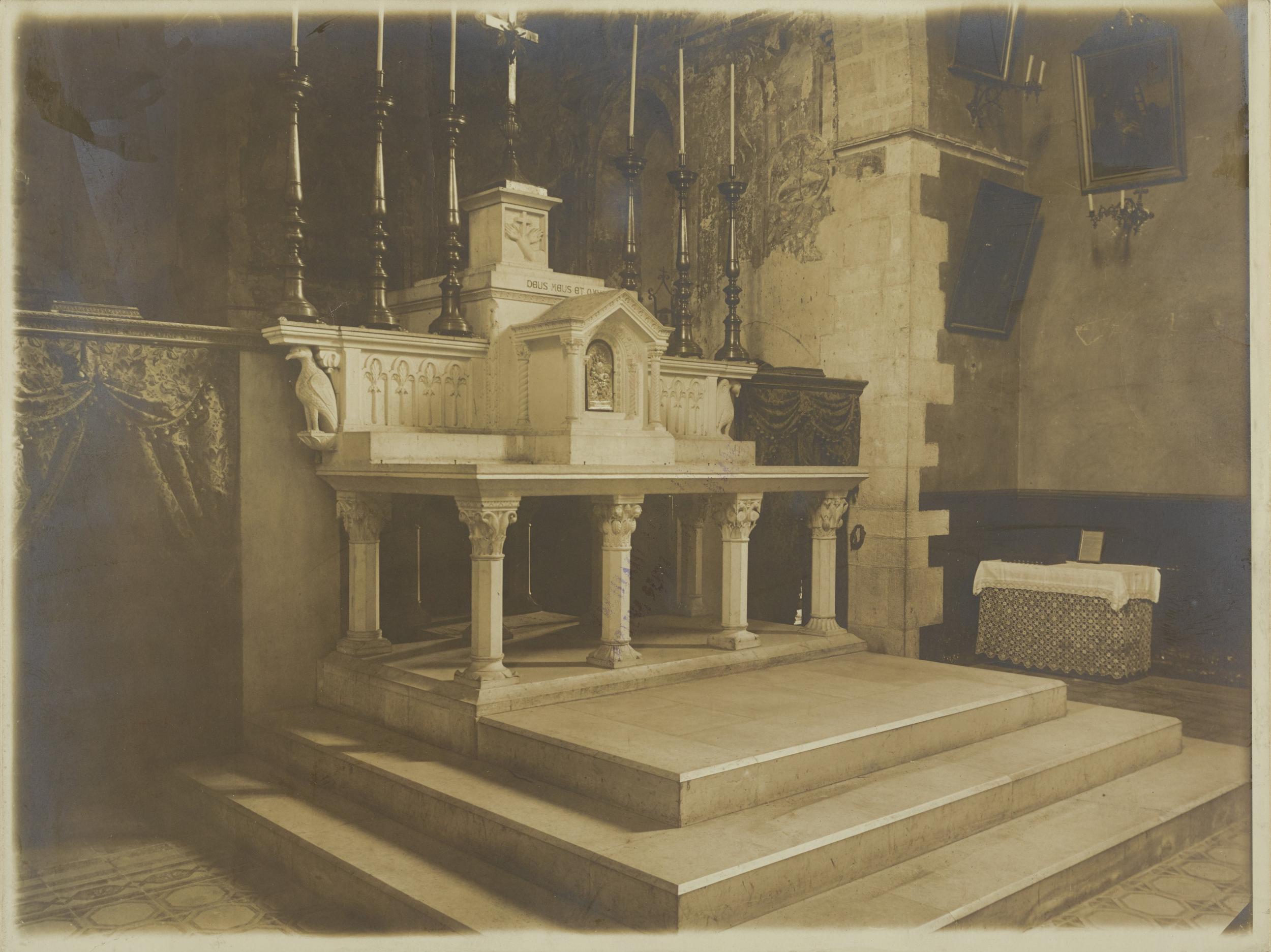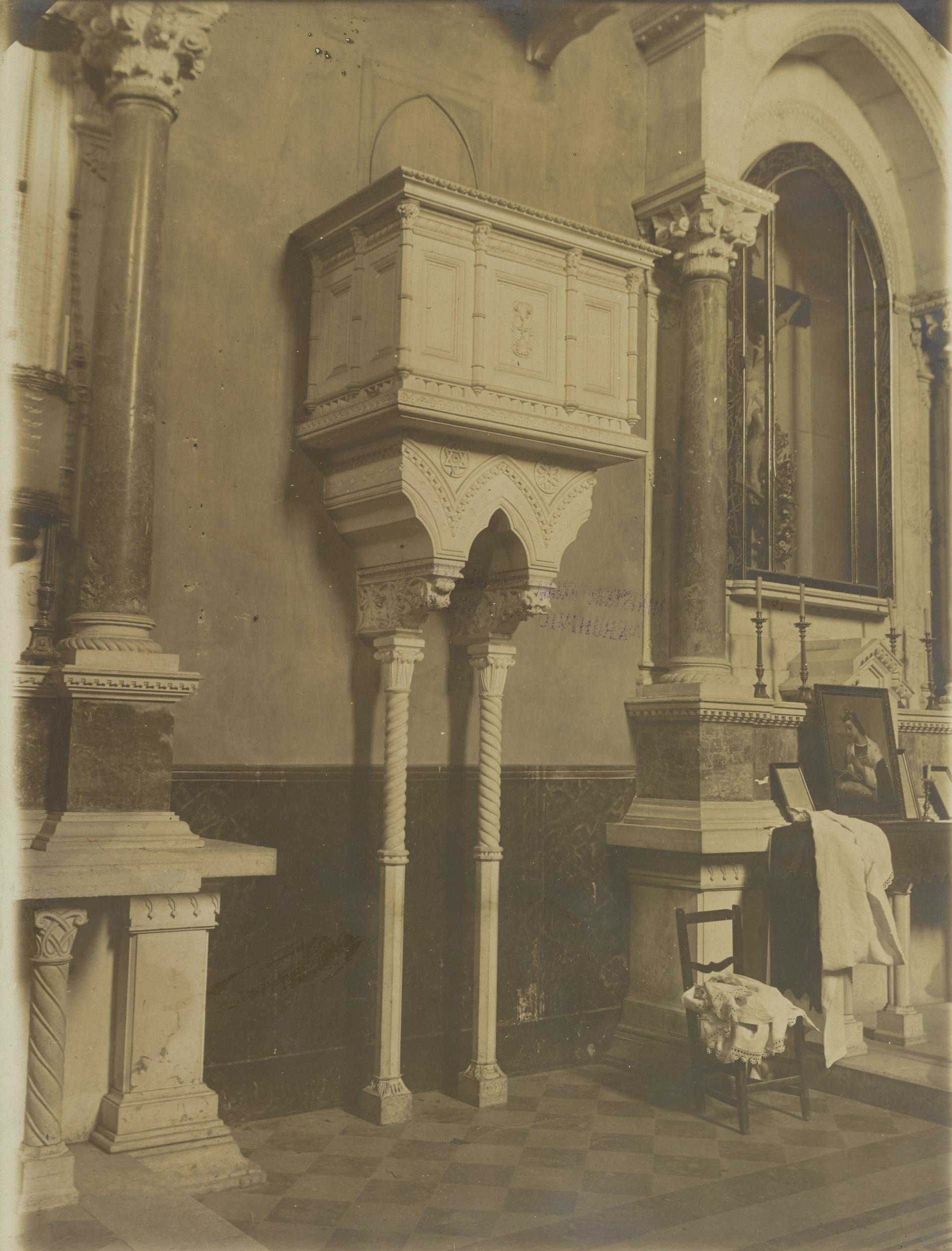 Fotografo non identificato, Bitonto - Chiesa di S. Leo, altare laterale e pulpito, 1894 post, gelatina ai sali d'argento/carta, MPI137905