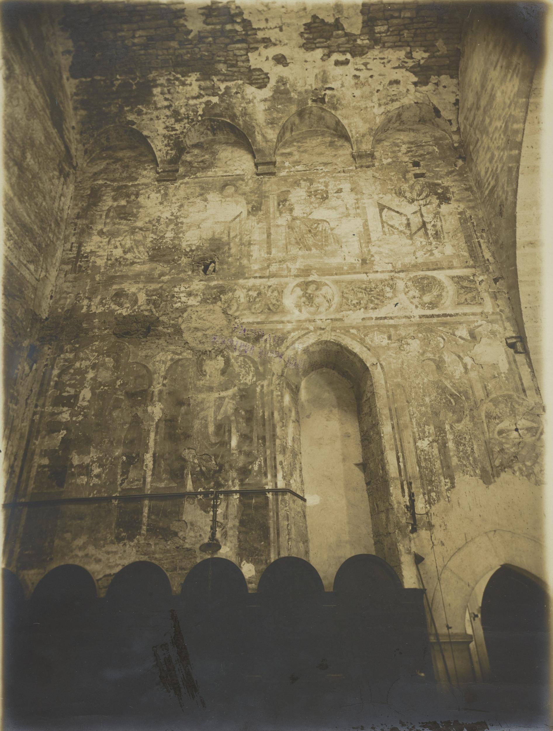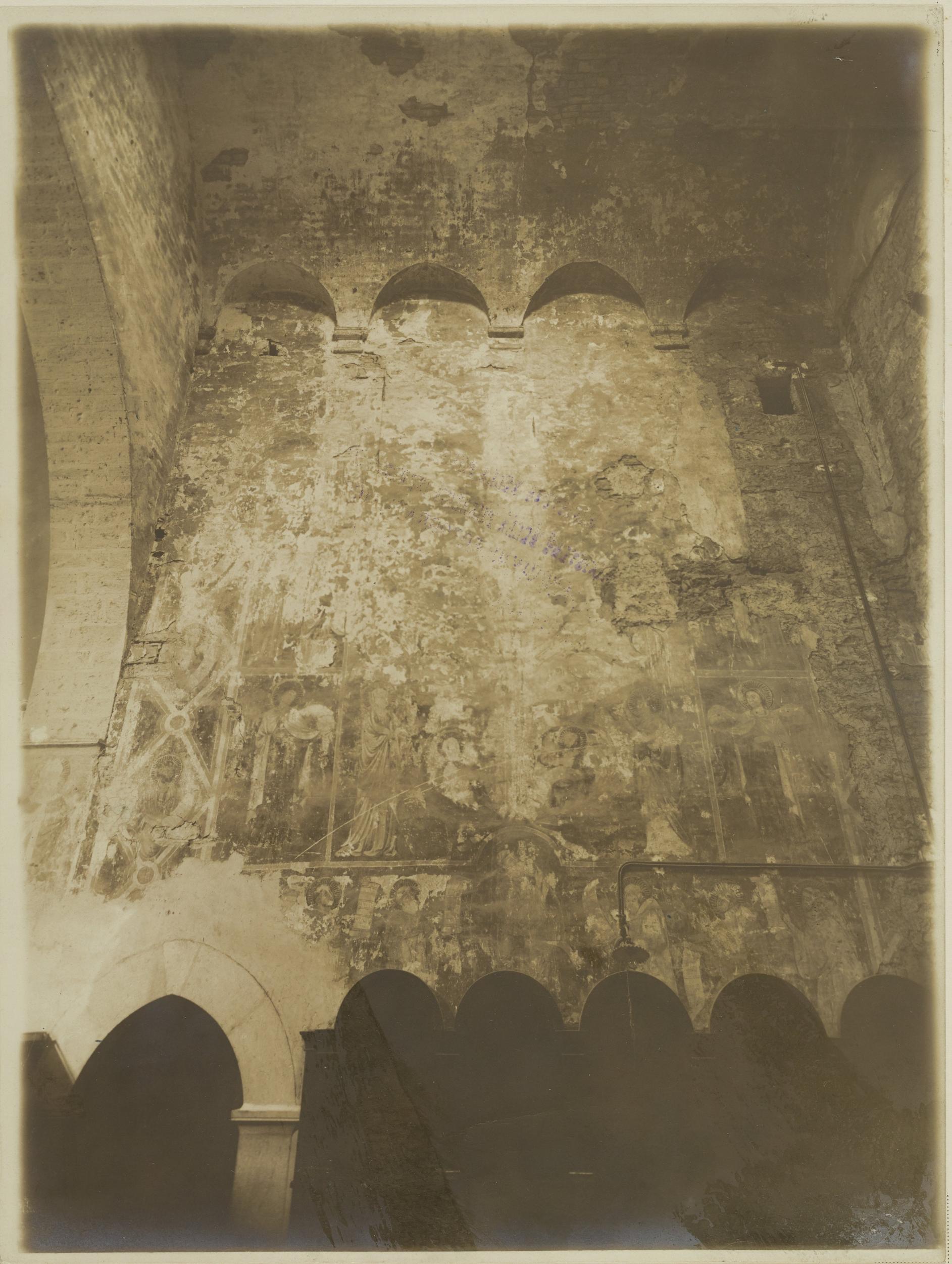 Fotografo non identificato, Bitonto - Chiesa di S. Leo, coro parete orientale, maestà in trono e santi, vescovi che salgono i gradini accompagnati da cristo, a destra oranti e paesaggi, urbano e cacciata dei reprobi, 1891-1900, gelatina ai sali d'argento/carta, MPI137902
