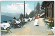 Bahnhof-Terrasse am Mendelpass (1360 m) gegen die Dolomiten. Tirol.