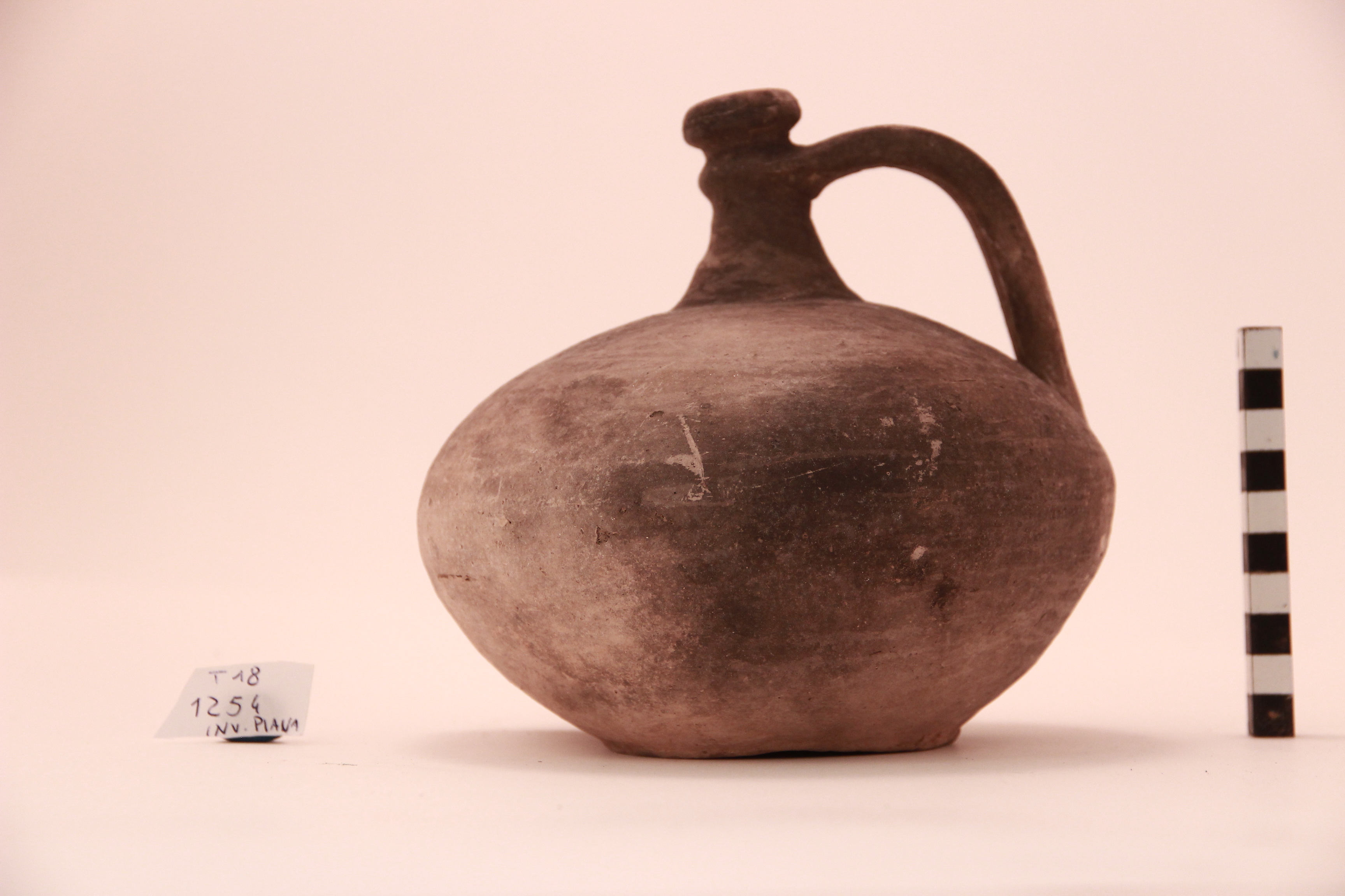 Orlo arrotondato sottolineato da collarino; collo cilindrico; corpo globulare a ventre schiacciato, apodo; ansa a nastro tricostolata impostata sul collarino e saldata nel punto di massima espansione del corpo
