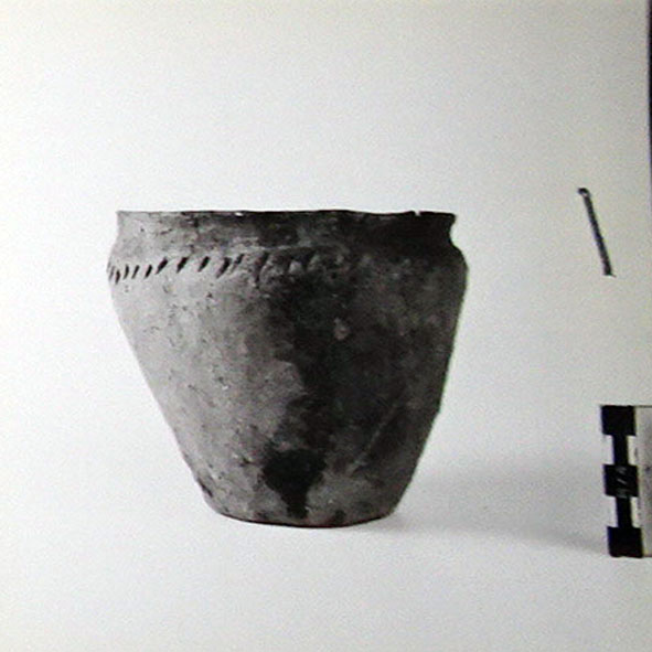 Orlo estroflesso sottolineato esternamente da leggero incavo; vasca troncoconica; fondo piano apodo. Decorazione: sulla spalla, fila orizzontale di unghiate impresse. La superficie è molto annerita all'interno e intorno all'orlo esternamente