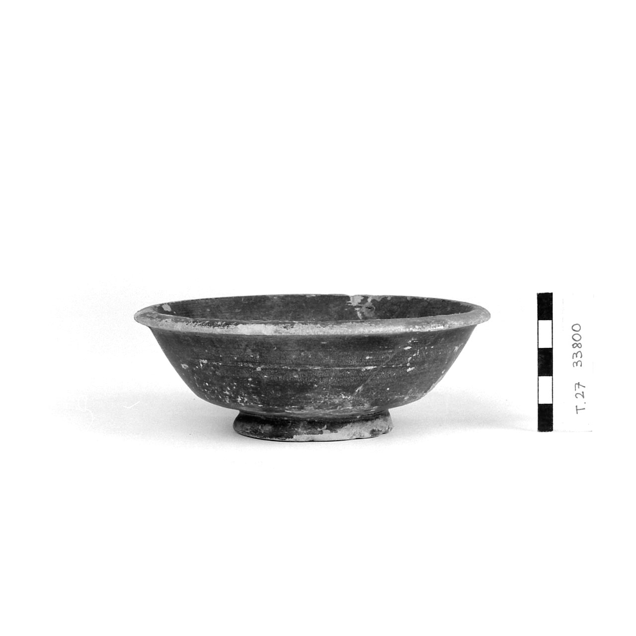 Orlo estroflesso, arrotondato; corpo troncoconico; piede ad anello. Vernice nera opaca