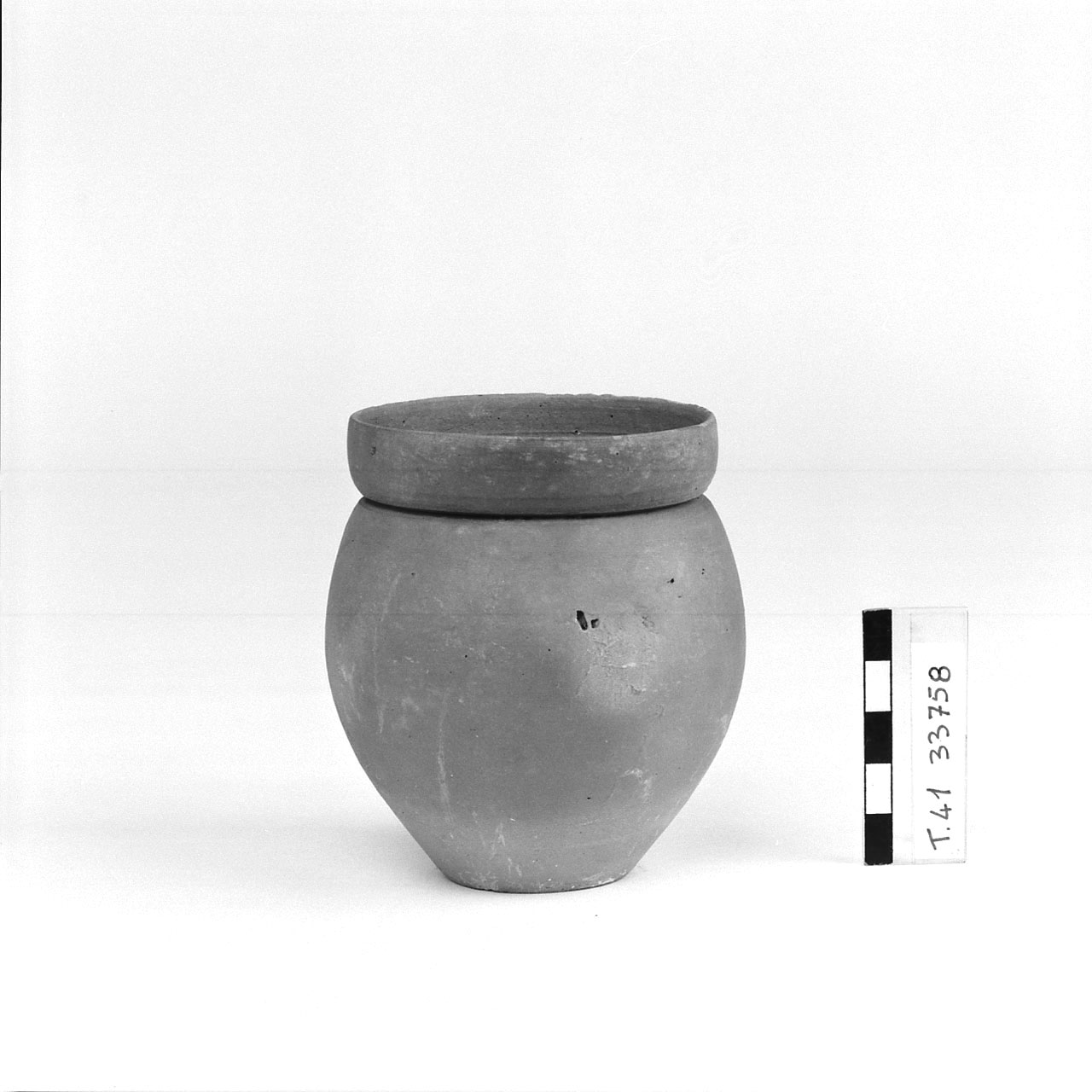 Orlo piuttosto pronunciato e leggermente rigonfio; corpo ovoide; fondo piano. Superficie di colore grigiastro che lascia libera una zona vicina al fondo, determinata dall'impilatura dei vasi durante la cottura