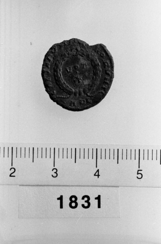 D/ [COSTAN]-TINVS AVG Testa laureata di Costantino,||a d.||R/ CAESARVM N[OST]RORVM Corona d'alloro intorno a:||VOT/./X. Sotto: AQL