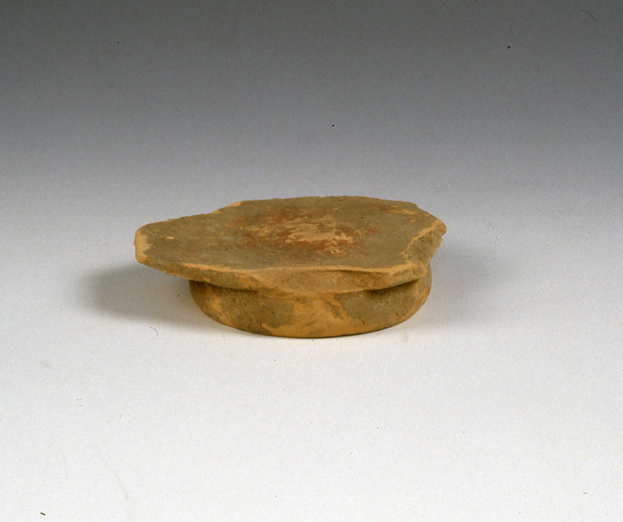 Alto piede ad anello sagomato segnato internamente da una profonda solcatura. Sul fondo interno cerchio impresso e bollo in planta pedis al centro. Vernice rosso-arancione