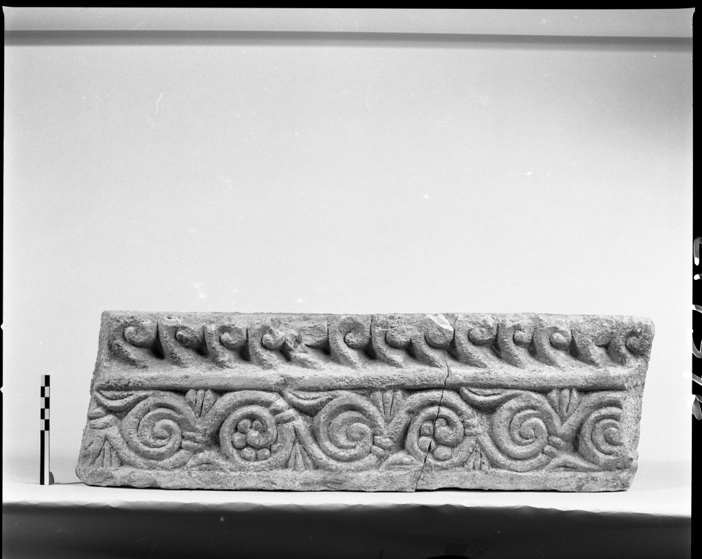 Frammento decorato, su una sola faccia, con un tralcio a cornucopia ad andamento sinuoso su cui si innestano volute a spirale. alternativamente, a doppio vimine e a nastro perlato; gli spazi liberi sono riempiti, in sequenza, da foglie verticali bipartite (che nascono dai punti di innesto) e da fogliette oblunghe. La decorazione è delimitata in alto da un listello a cordone, su cui si dispone una fascia di caulicoli piegati a sinistra, mentre in basso vi è un listello piano. La faccia superiore presenta le tracce per l'inserimento di grappe metalliche con foro circolare ed incisione nastriforme