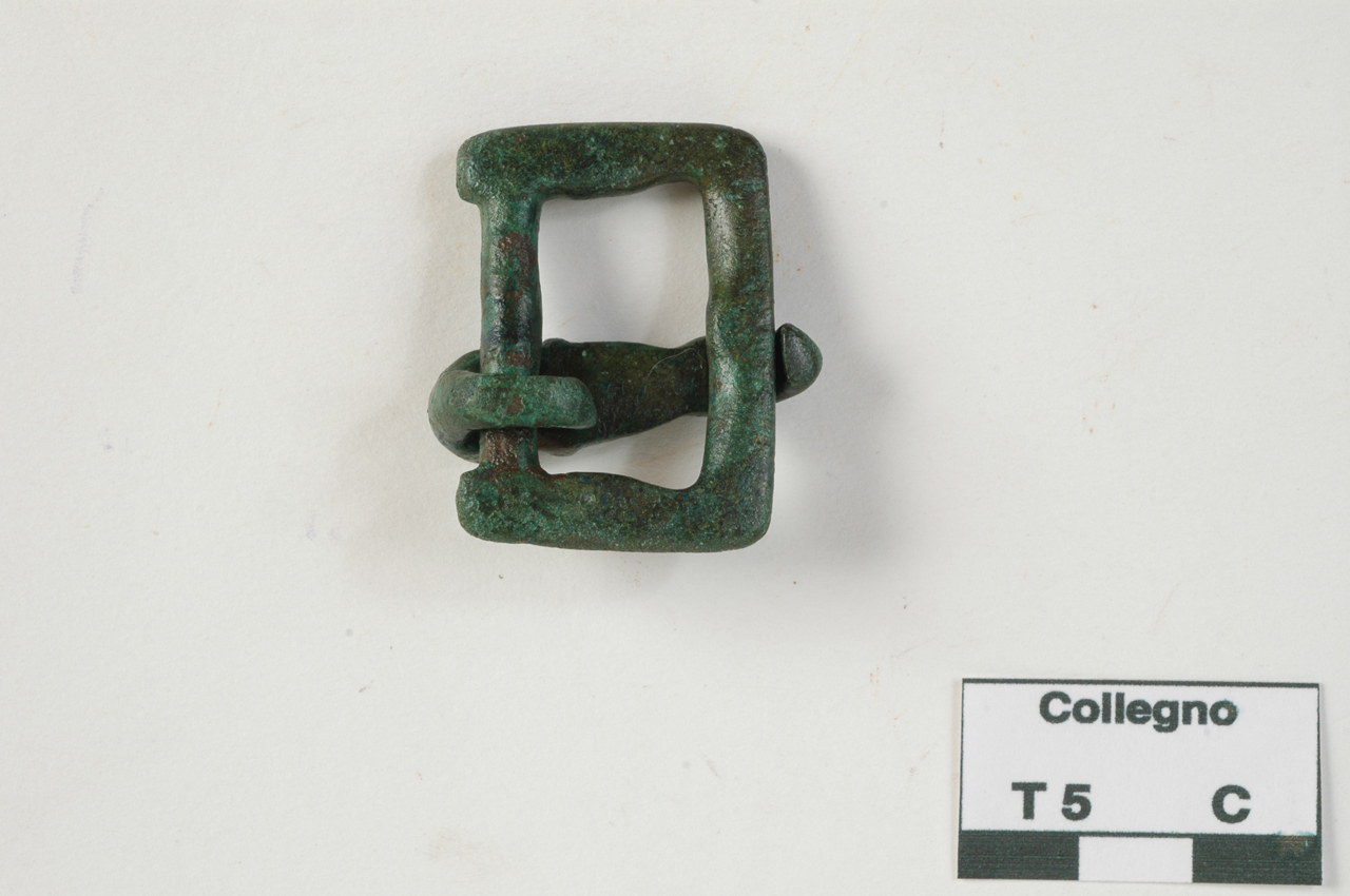 Fibbia con anello rettangolare caratterizzato da espansioni interne lungo i lati brevi e sezione lenticolare; traversa più stretta a sezione circolare; ardiglione, articolato alla traversa mediante un gancio posteriore, con base a scudetto e strozzatura presso la punta, ricurva; retro dell'ardiglione piatto