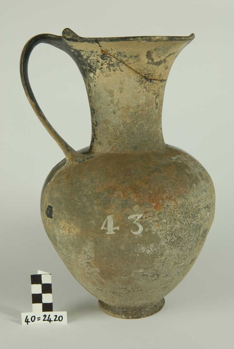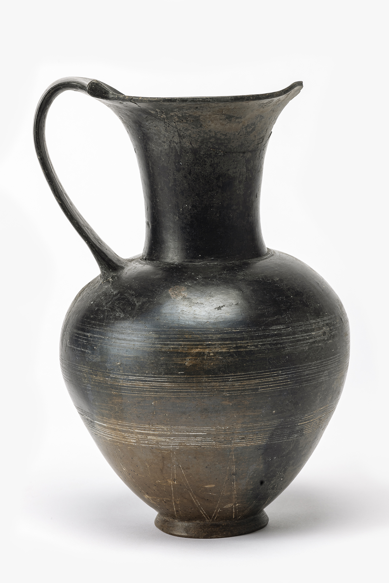 Oinochoe con bocca trilobata, collo alto e cilindrico, spalla ampia, corpo piriforme, piede basso a echino rovesciato, ansa a nastro sormontante impostata sulla bocca e sulla spalla e desinente in alto in due apici triangolari. Decorazione: sul corpo due fasci di striature orizzontali