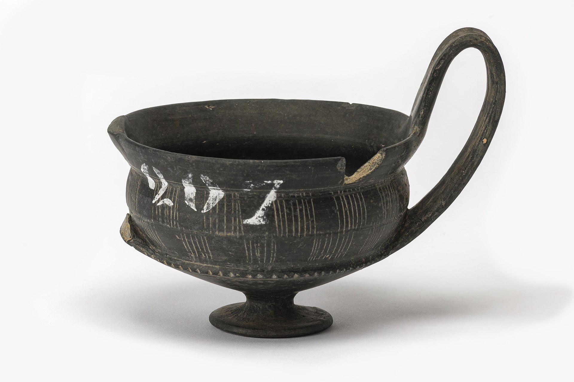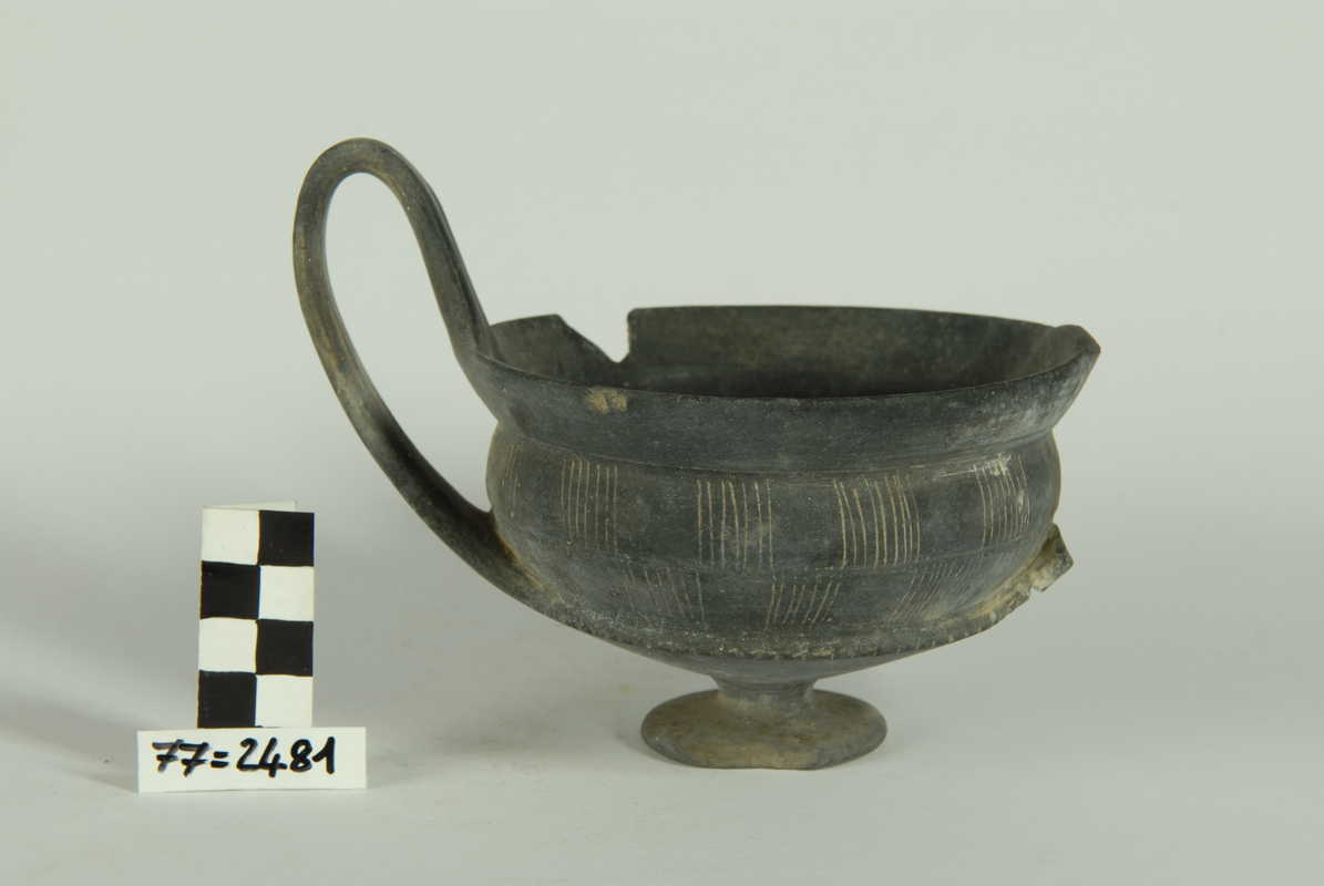 Kantharos con labbro obliquo verso l'esterno, distinto dal corpo, tazza panciuta obliqua e sporgente, piede a tromba, anse a nastro sormontanti impostate verticalmente sull'orlo e sulla carena, con margini rialzati in alto. Decorazione: su due registri divisi da una scanalatura, alternanza di spazi vuoti e spazi con striature verticali. Sulla carena intagli a punta di diamante