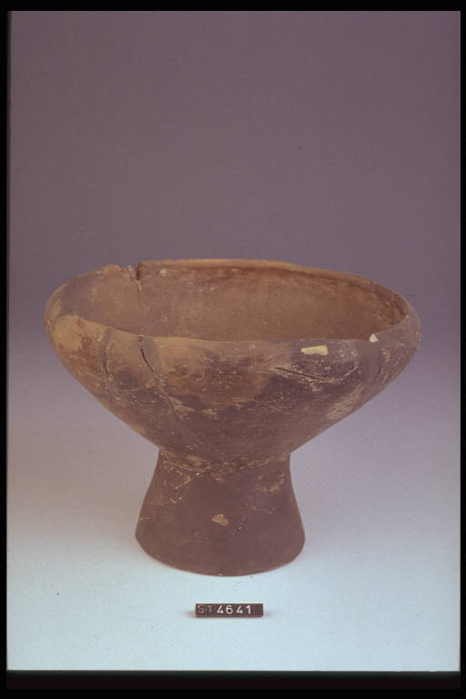 Coppa a corpo troncoconico, orlo rientrante, alto piede troncoconico. Colore nerastro; superficie nera e lucida, sul fondo interno è inciso un motivo a raggiera