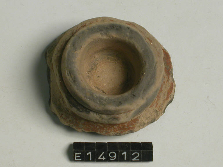Frammento di piede svasato di recipiente a calice decorato da un anello nella strozzatura, dipinto di rosso