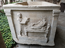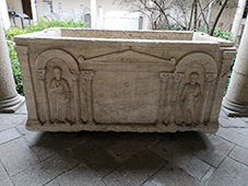 - NOTIZIE STORICO CRITICHE Il sarcofago è scolpito su tre lati, mentre il secondo lungo è grezzo. Sul fonte principale, campito in tre edicole secondo la tipologia cisalpina a tabernacolo (un arco, un timpano, un arco), con colonne lisce e capitelli composito. L’edicola centrale è oggi abrasa ma l’iscrizione è riportata dalle fonti (cfr. supra), e da essa apprendiamo che il titolare del sarcofago è il giovane Gaio Valerio Petroniano, effigiato a figura in piedi stante nelle edicole laterali: a sinistra palliato, a destra togato a significare le prime tappe del suo cursus. Sul lato sinistro il defunto è rappresentato su kline, con inmano una corona funebre e un volumen socchiuso, mentre un servo in piedi gli porge (o sta per leggergli?) un altro volumen nel suo contenitore. Sul lato destro il defunto sta sostenendo una causa giuridica, nel corso di una legatio peregrina, davanti ad un magistrato seduto in tribunal; il giovane è assistito dal padre, barbuto, in abito da viaggio (tunica e paenula), che gli pone la mano sulla spalla. Il sarcofago (di probabile provenienza dalla necropoli di Porta Orientale) è stato datato dalla Rossi intorno al 320, per analogie con il sarcofago di Sant’Elpidio a Mare; ma faccio rilevare i contatti con quelli di Sosia Herennia e Sosius Felicinaus nonché di Appeiena Philumene e Publius Titius Sabinus oggi entrambi nel Lapidario Estense di Modena con datazione alla seconda metà del III secolo (schede di N. Giordani e M. Ricci in Il Museo Lapidario Estense. Catalogo generale, a cura di N. Giordani e G. Paolozzi Strozzi, Padova 2005, F Ovest 64, pp. 177-179 e F Est 122, pp. 183-185). Pensare ad una sistemazione nell’età di Massimiano Erculeo (286-305) mi sembra possibile. Più vaghi ma non assenti i legami con il Sarcofago di Lambrate, oggi al Castello Sforzesco (M. Mirabella Roberti, Milano romana, Milano 1984, p. 199), mentre mi paiono laschi quelli col Sarcofago di Sant’Aquilino. Nel caso in esame, l’effigiato è un giovane morto in età prematura, ricordato dal padre per le prime, brillanti tappe di un cursus promettente; il che fornice preziosi dettagli tipologici su oggetti e gestualità della vita privata e pubblica. Sono stati rilevati (Rossi 1990) gli apporti grecizzanti e la dialettica fra vita attiva e vita contemplativa: penso però che l’enfasi sia sulla preparazione intellettuale vasta del patronus (il grande tema del De oratore ciceroniano). Forse dal IV secolo, il sarcofago venne adoperato come sepolcro del vescovo Dionigi nella sua basilica, forse in alternanza con la vasca in porfido dalle Terme Erculee (cfr. scheda 4). Nel 1783 venne acquisito dal conte Alfonso Castiglioni, rimanendo probabilmente nel palazzo milanese di famiglia (anche se è possibile l’ipotesi alternativa del trasporto nella collezione archeologica familiare a Castiglione Olona) fino alla donazione a fine Ottocento nelle Civiche Raccolte Archeologiche, prima nel palazzo di Brera, poi nel Castello Sforzesco, infine nel Civico Museo Archeologico
