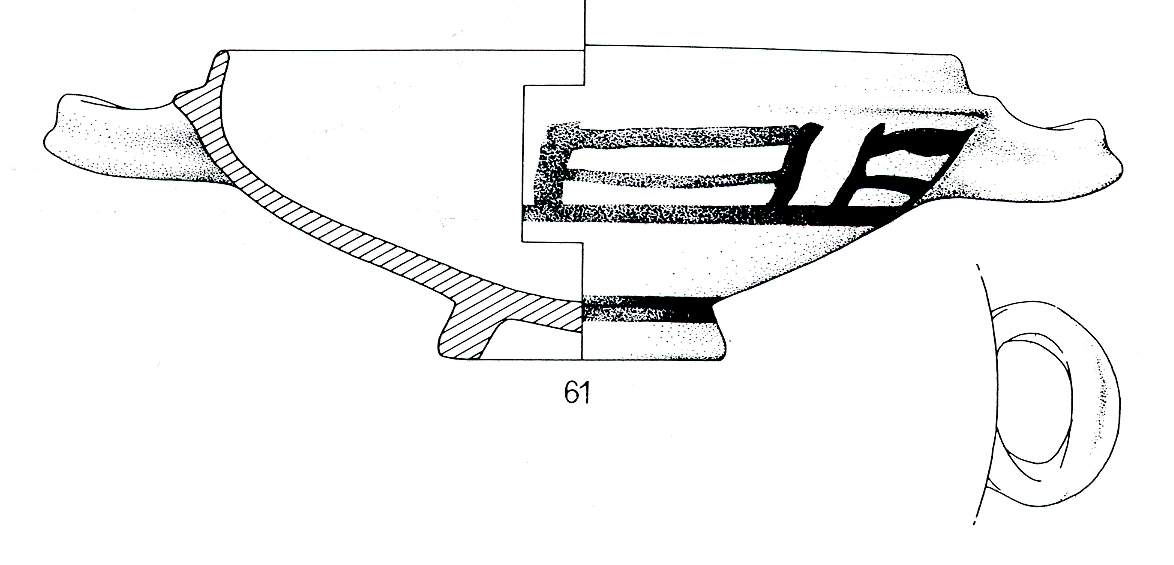 labbro rettilineo, obliquo verso l'interno con orlo arrotondato; listello orizzontale per la posa del coperchio; vasca troncoconica con lieve inflessione all'altezza delle anse; piede ad anello obliquo; anse a nastro insellato, applicate orizzontalmente sotto il battente; all'esterno decorazione a vernice nerastra molto diluita a motivi geometrici; corpo ceramico arancio-rosato, polveroso; vernice nerastra, molto diluita