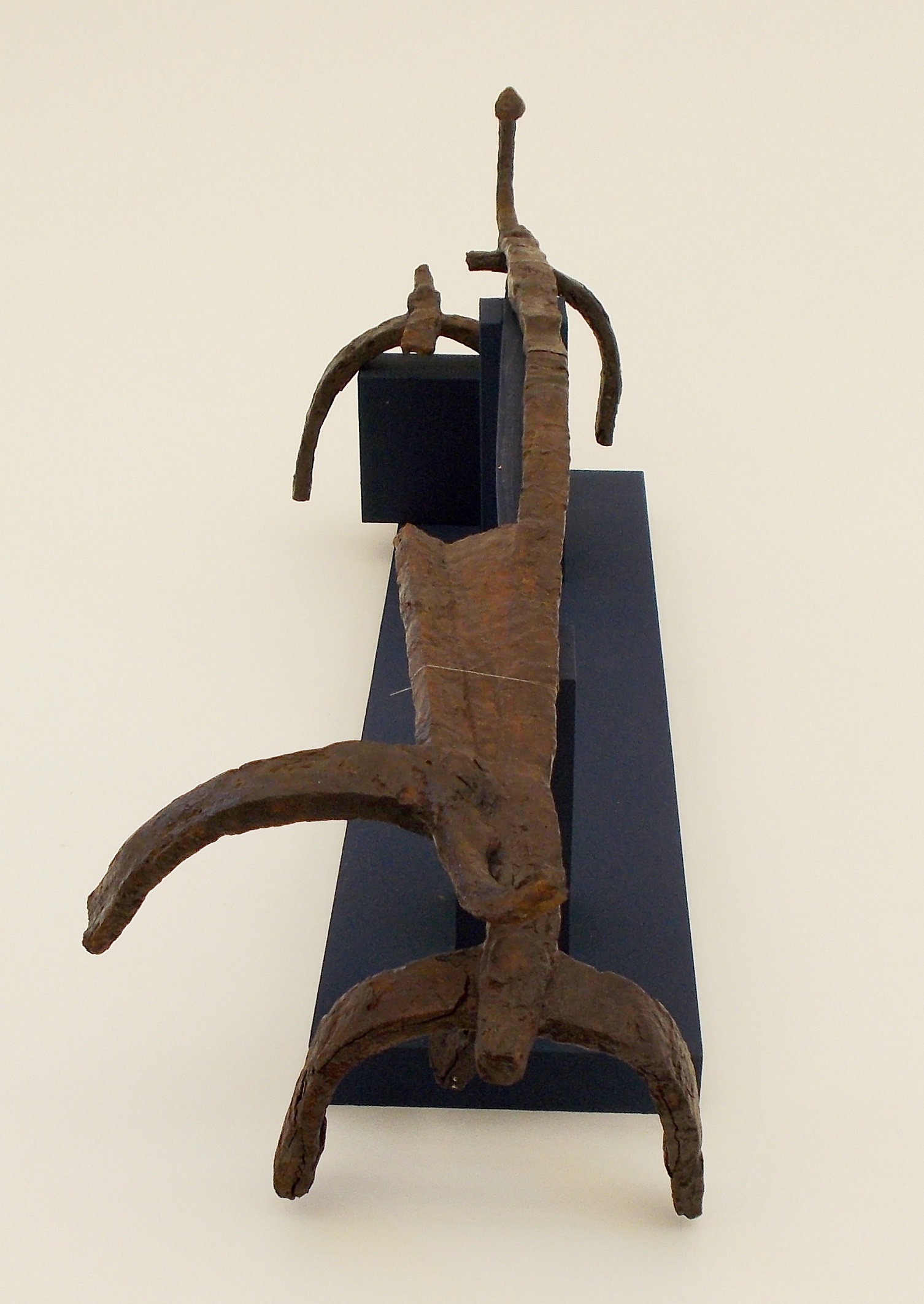 Fusto orizzontale, a sezione quadrangolare, con estremità ripiegate e terminanti con ingrossamento globulare, sostenuto da piedi a "ferro di cavallo"
