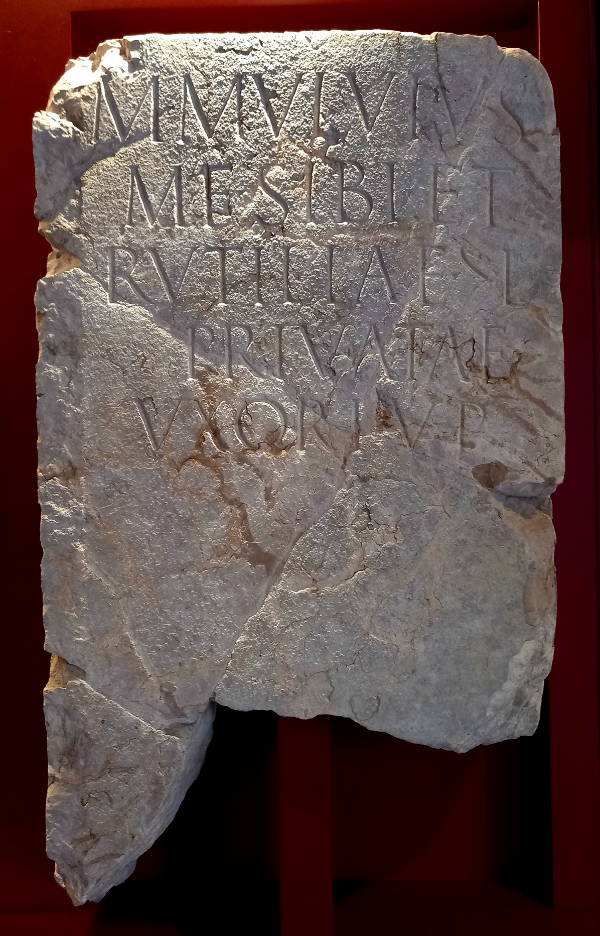 - ISCRIZIONI parte superiore - M. Mulvius / M. f. sibi et / Rutiliae ((mulieris)) l. / Privatae / uxori v. p - lettere capitali - a solchi - latino