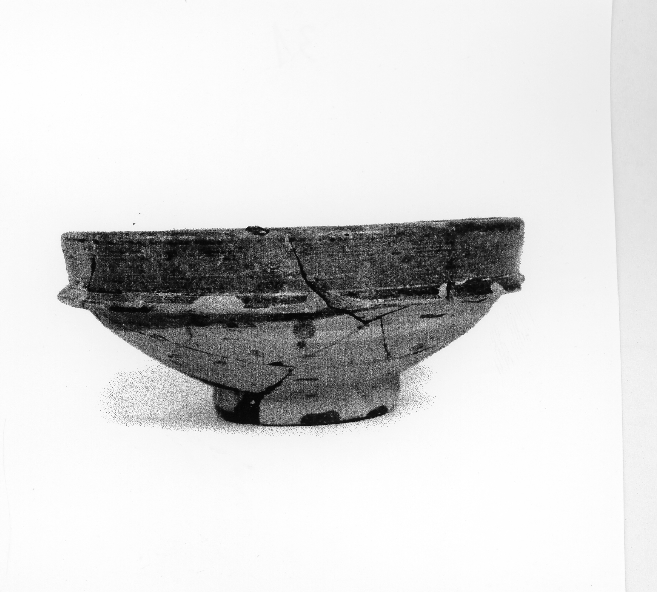 Piede ad anello umbonato, cavo a costolatura alta, orlo dritto, labbro arrotondato. Vetrina giallo-bruna