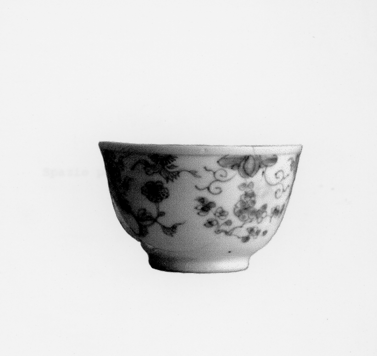 Porcellana dura traslucida. Piede ad anello, cavo a calotta, labbro assottigliato. Int.: motivo floreale centrale, banda a nastro di segmenti. Est.: motivo vegeto-floreale pendente con rami di pruno. Colori: blu