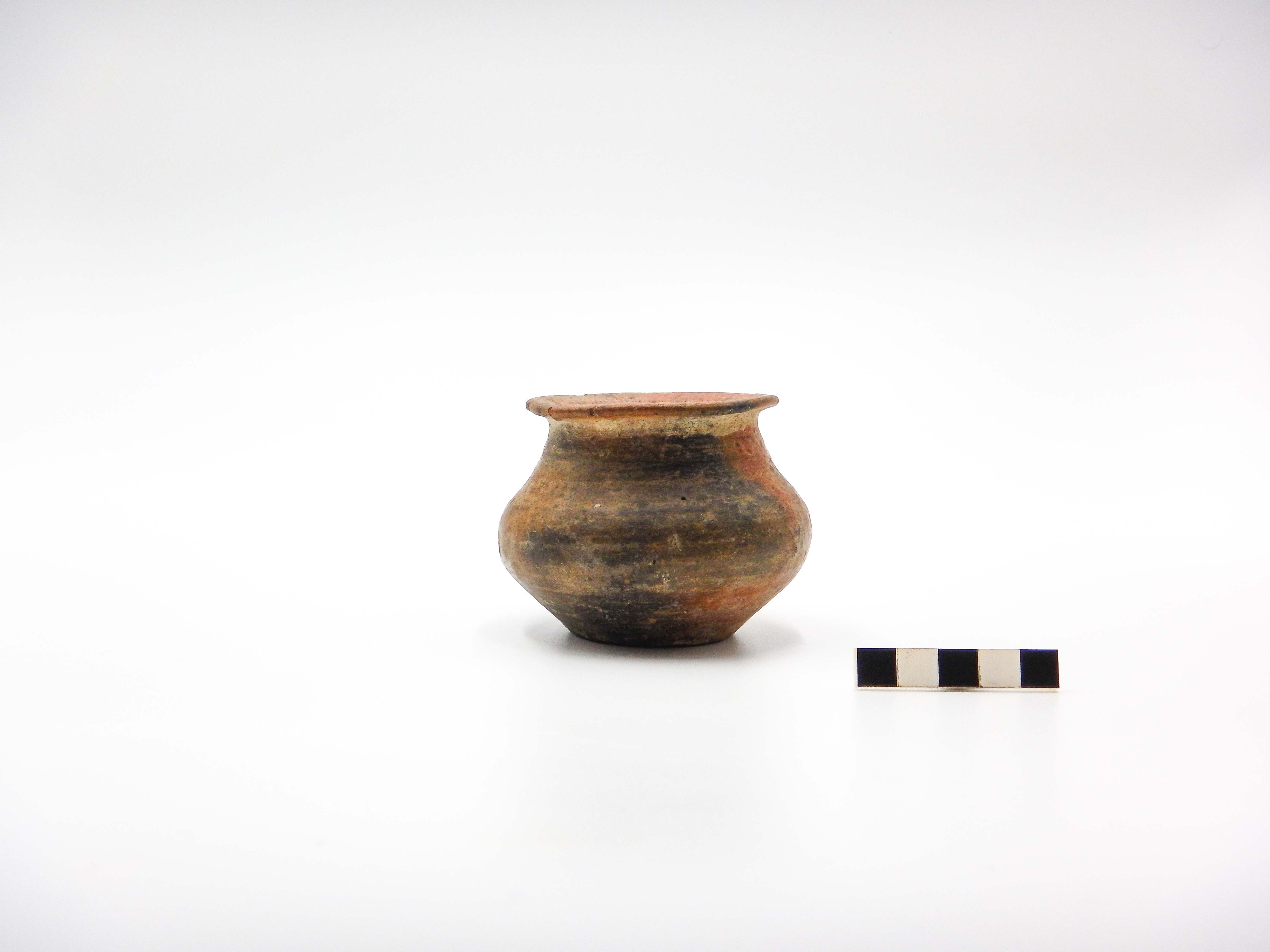 Olla a corpo rigonfio scheggiata verso l'orlo, impasto semi-fine e compatto, superficie esterna rossiccia e sommatamente lucidata