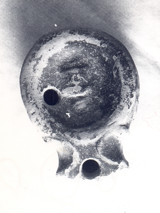 Lucerna monolicne non ansata; serbatoio troncoconico rovescio a fondo piatto; spalla costituita da una larga fascia delimitata da un solco, disco appena concavo con foro di alimentazione fuori centro. Becco a volute tipo Loeschcke IB. Motivo decorativo del disco: vaso ad alto piede