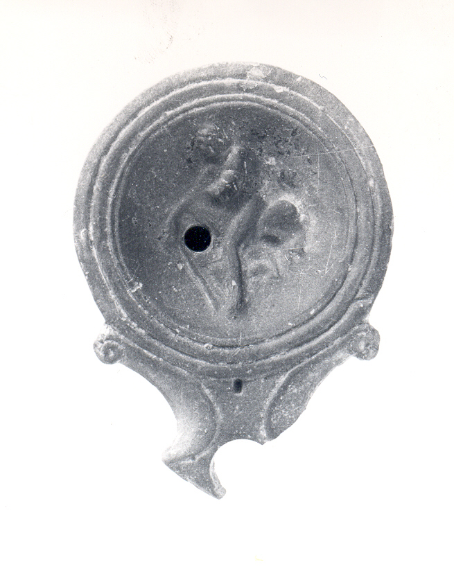 Lucerna monolicne non ansata. Serbatoio troncoconico rovescio. Spalla a tre anelli di diversa larghezza. Disco concavo e decorato. Foro di alimentazione fuori centro. Becco a volute semplici e punta triangolare, molto più largo alla base che in punta. Sul becco forellino di ventilazione. Motivo decorativo del disco: figura maschile (Ercole?) in riposo seduto su una roccia (coperta dalla leonté?); appoggia il braccio destro sul ginocchio destro piegato, tenendo in mano una clava, poggiata a terra