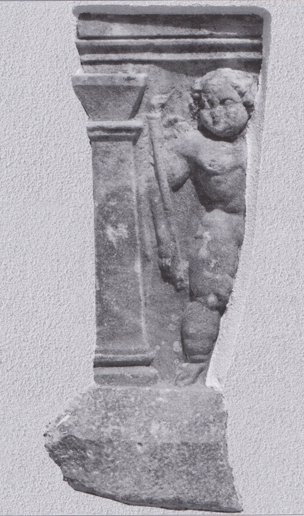 Si conserva un pilastrino a fusto liscio su base modanata, con capitello troncoconico con fascia piatta di coronamento, anche liscio e raccordato al pilastro da un anello. Superiormente, dopo un breve spazio, si trovano i profili di coronamento della cassa. Segue sulla destra la figura, solo parzialmente conservata, di un erote alato dalle forme fortemente obese, raffigurato leggermente di scorcio verso sinistra, con il braccio destro discosto dal fianco, in atto di sostenere una fiaccola accesa rivolta verso l’alto
