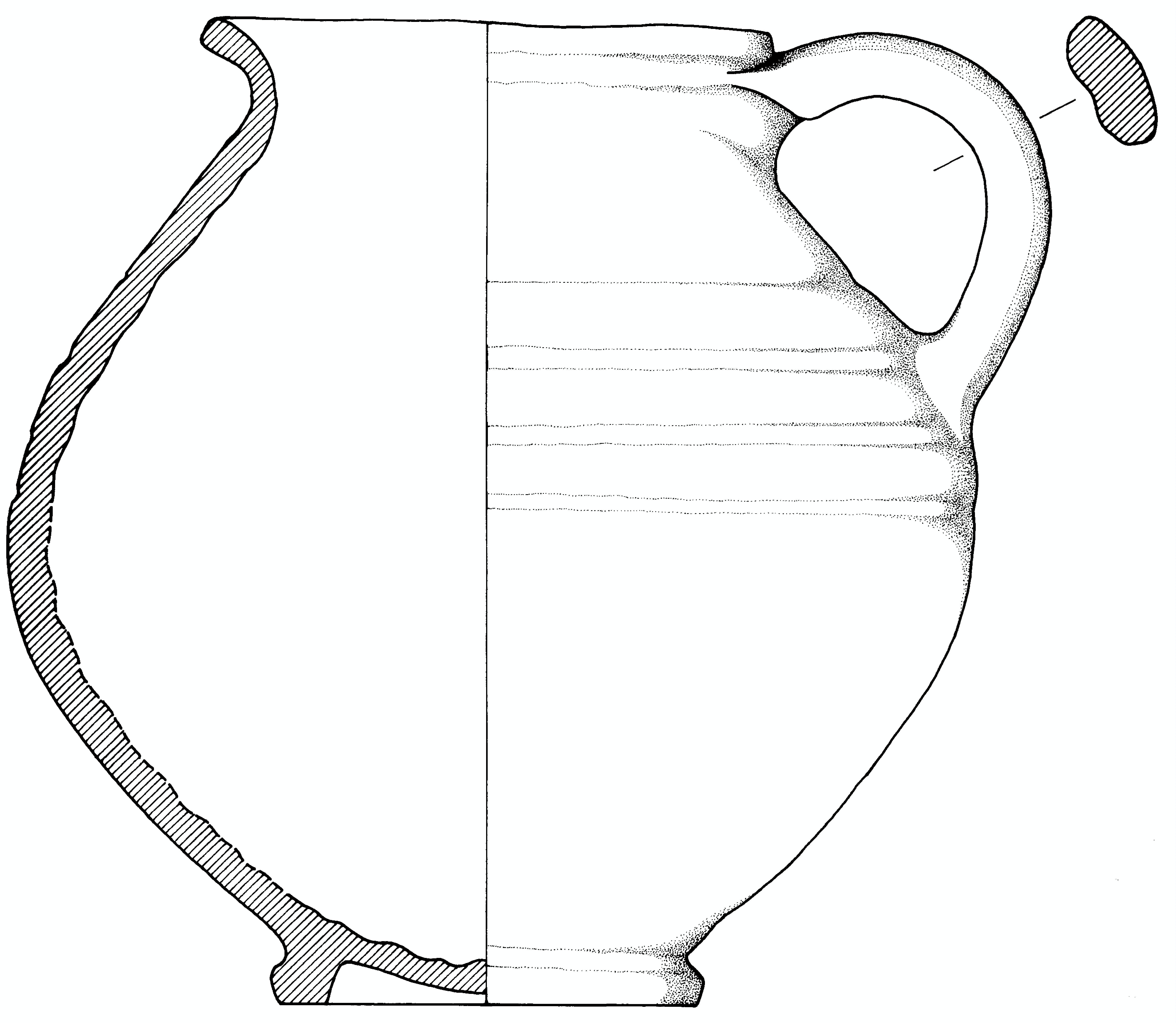 orlo ingrossato e rivolto verso l'esterno, con profilo superiore leggermente concavo e profilo esterno convesso, distinto sulla parete esterna da una gola, bordo affilato; corpo a sagoma bitroncoconica; piede ad anello con base di appoggio larga e piatta, a pofilo esterno verticale. Ansa a nastro con profilo esterno convesso, impostata verticalmente sulla spalla e al di sotto dell'orlo. Ceramica d'impasto molto depurato, di colore crema chiaro, farinoso, tenero. Produzione locale o regionale