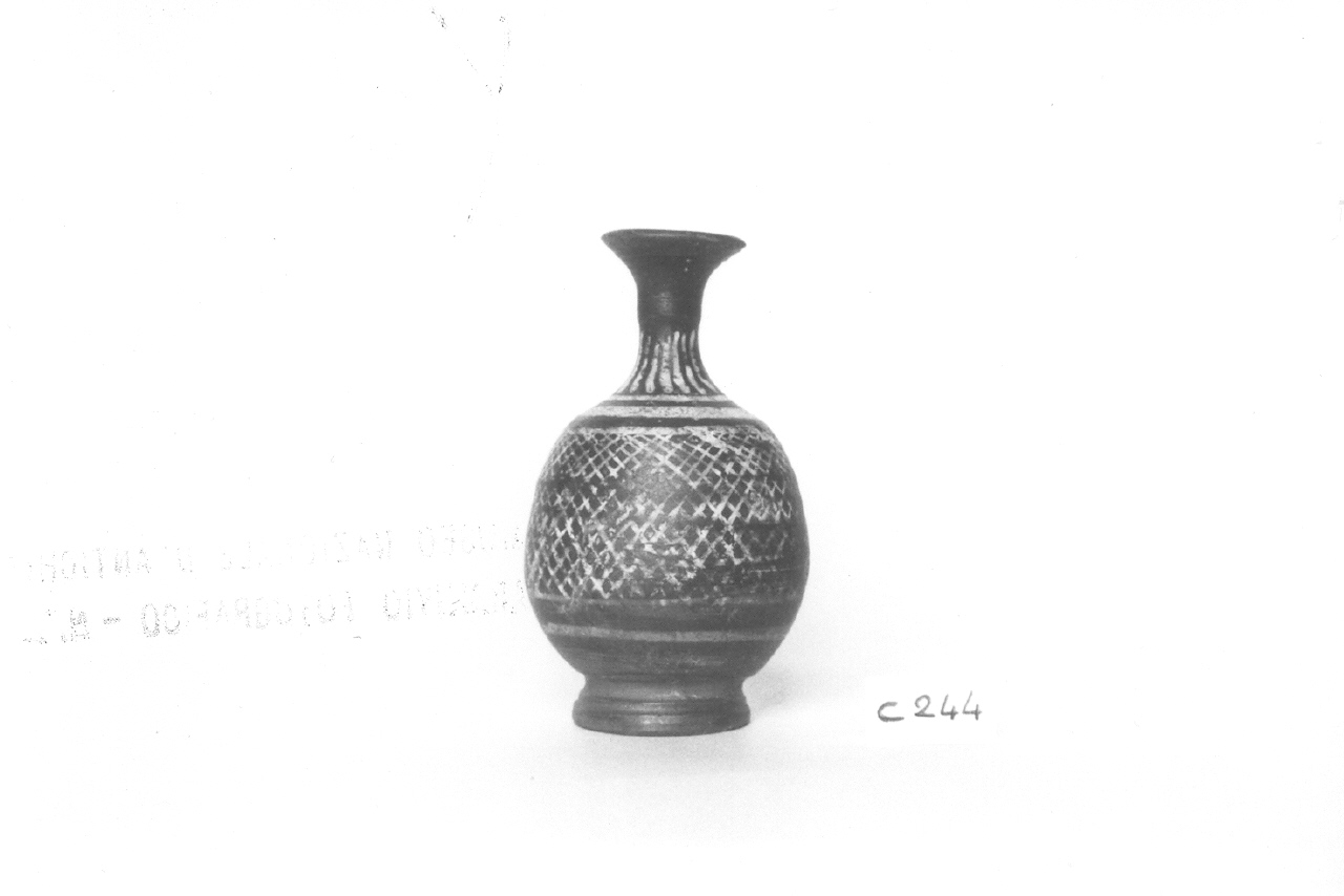Lekythos ariballica a vernice nera con decorazione sovradipinta. Argilla giallo arancio, vernice nera bruna opaca, colore sovradipinto bianco e giallo. Base a listello modanato, corpo globulare allungato, collo sottile, bocchino a tromba, ansa a bastoncello. Sul corpo, tra linee bianche e gialle, fitta decorazione a reticolato bianco, sul collo baccellature semplici; decorazione interrotta attorno all'attacco dell'ansa sottolineata da raggiera tra linea a ferro di cavallo ed altre due lineette orizzontali sull'ansa