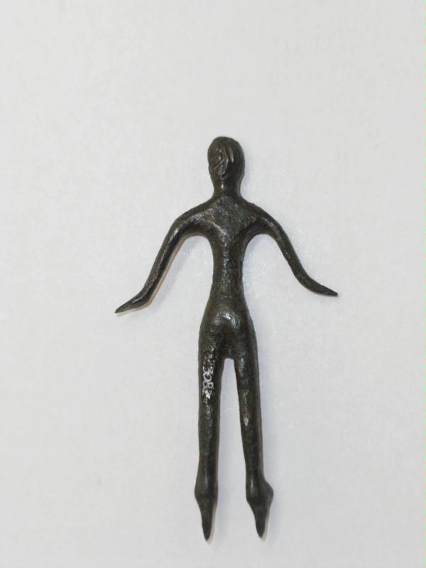 bronzetto votivo raffigurante un personaggio maschile stante con braccia divaricate con le estremità delle mani rivolte verso l'alto, gambe leggermente divaricate, organi sessuali in rilievo; stile schematico, volto sfaccettato con incisioni circolari per gli occhi e solco triangolare per la bocca; incisioni per indicare le dita delle mani; capezzoli e ombelico ottenuti con incisioni ad occhio di dado. Perni di fissaggio sotto ai piedi
