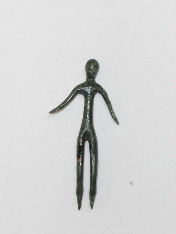 bronzetto votivo schematico raffigurante personaggio maschile stante; le braccia sono divaricate con le estremità delle dita leggermente rivolte verso l'alto; le gambe sono parallele e leggermente divaricate; i lineamenti del volto sono ottenuti mediante incisioni, capezzoli e ombelico con incisioni a occhio di dado, organo sessuale rilevato; perni di fissaggio sotto i piedi