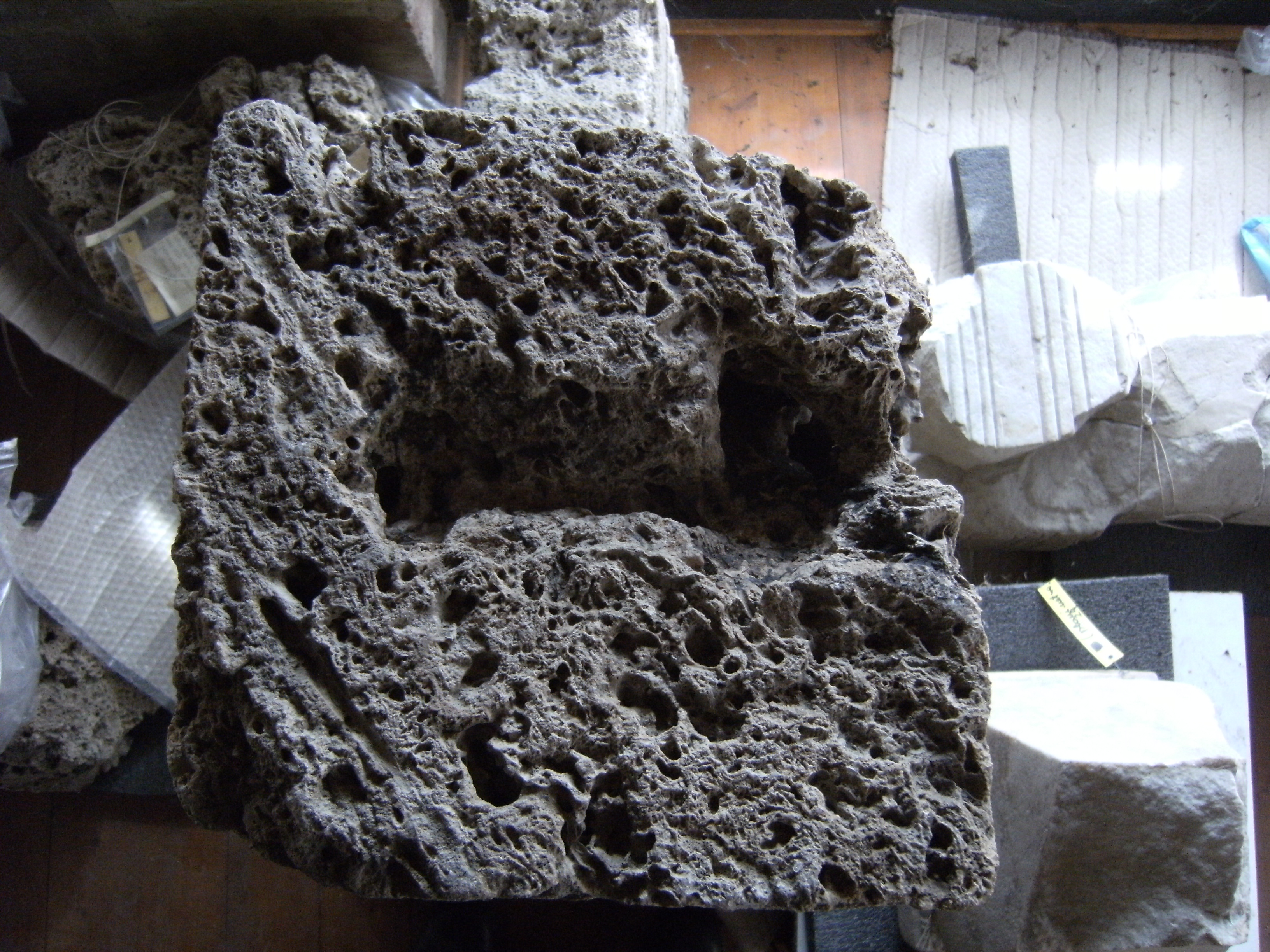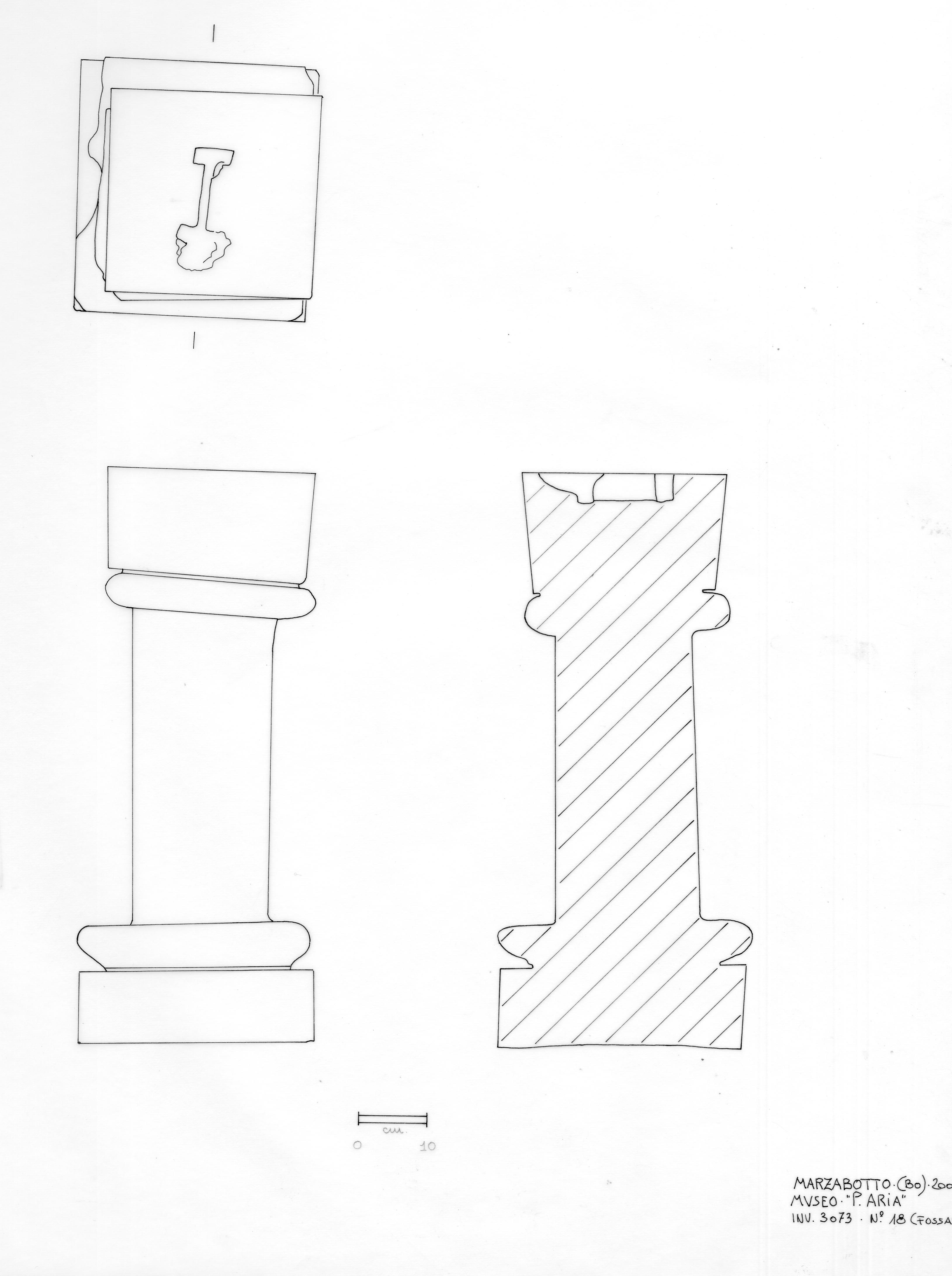 Cippo in travertino locale, a pilastrino a sezione quadrata con base e capitello, sulla superficie superiore incasso per grappa a doppia T. Restaurato con integrazioni