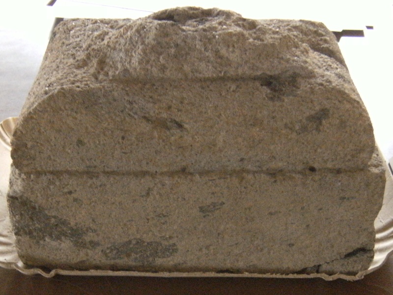 Piccola base in arenaria grigia chiara con qualche maculazione scura, di forma rettangolare costituita da un alto abaco sormontato da toro e resti di altro elemento parallelepipedo di coronamento. Due maculazioni scure sulla superficie superiore sono ipoteticamente riconducibili all'innesto dei piedi di una statuetta votiva