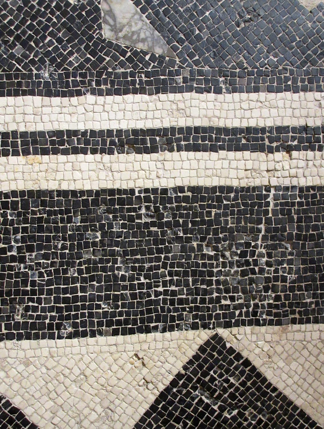 Frammento di tappetto musivo, relativo al tratto absidato dell’ambiente (B) con fascia di raccordo del vano e bordo della nicchia in tessellato bianco-nero, con tessere di calcare di dimensioni piccole (cm 0.08-0.09 ca.), e campo della nicchia in opus scutulatum