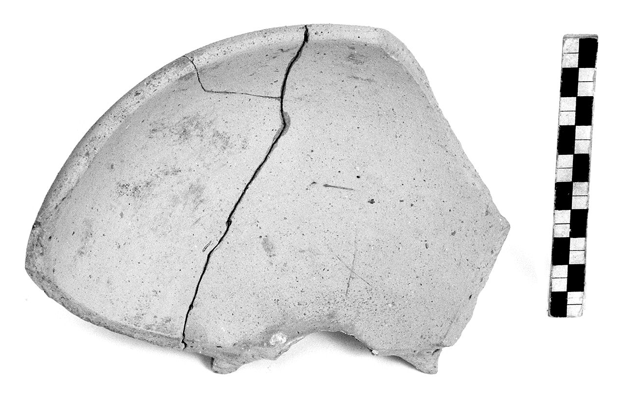 Orlo introflesso, con bordo arrotondato; vasca emisferica; pede ad anello. Sulla parete presso il fondo, internamente, segno a croce. Argilla dura,ruvida al tatto, di colore arancio-giallastro; presenti minuti e piccoli inclusi di vari colori in bassa frequenza