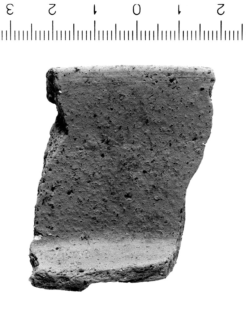 Orlo estroflesso, con bordo ingrossato all'esterno a sezione triangolare;vasca troncoconica con parete a profilo rettilineo. All'esterno e sull'orlo tracce di vernice (?) rossastra opaca. Impasto semidepurato arancio, duro e granuloso, con frequenti inclusi biancastri