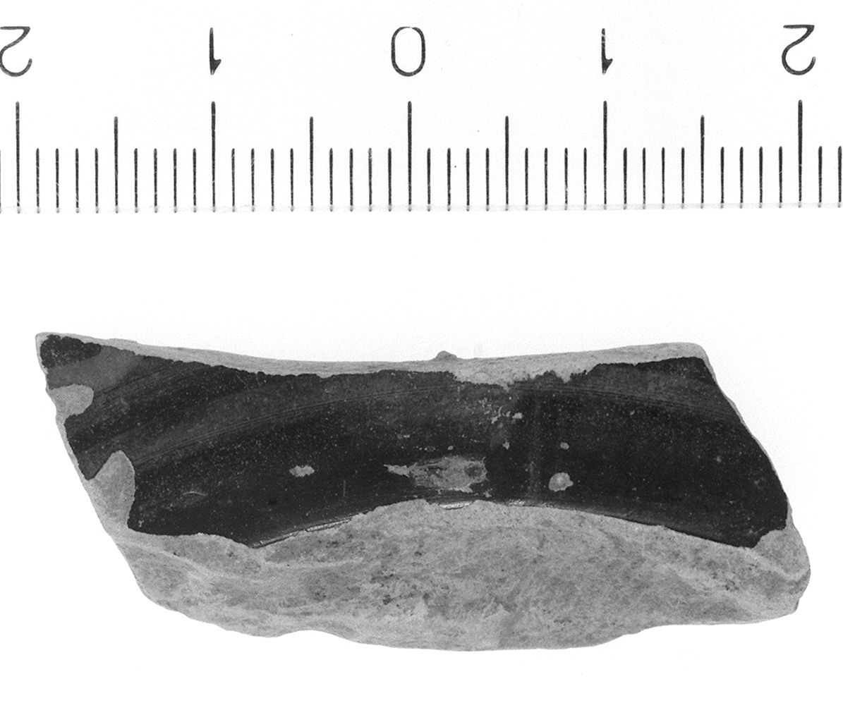 Fondo a profilo rettilineo. Decorazione sovradipinta: all'interno, motivifitomorfi non identificabili, alternati ad una linea orizzontale, in vernice rossastra diluita; all'esterno, fasce orizzontali concentriche, in vernice bianca molto diluita. Argilla fine, beige-rosata. Vernice nera, coprente e lucente