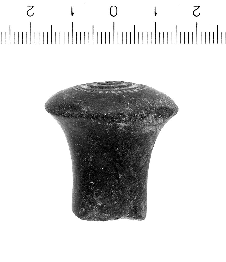 Corpo cilindrico; testa a base convessa. Sulla base, decorazione a stampiglia con motivo a tre cerchielli concentrici con apice centrale e margine dentellato. Superficie lisciata. Bucchero nero, piuttosto opaco