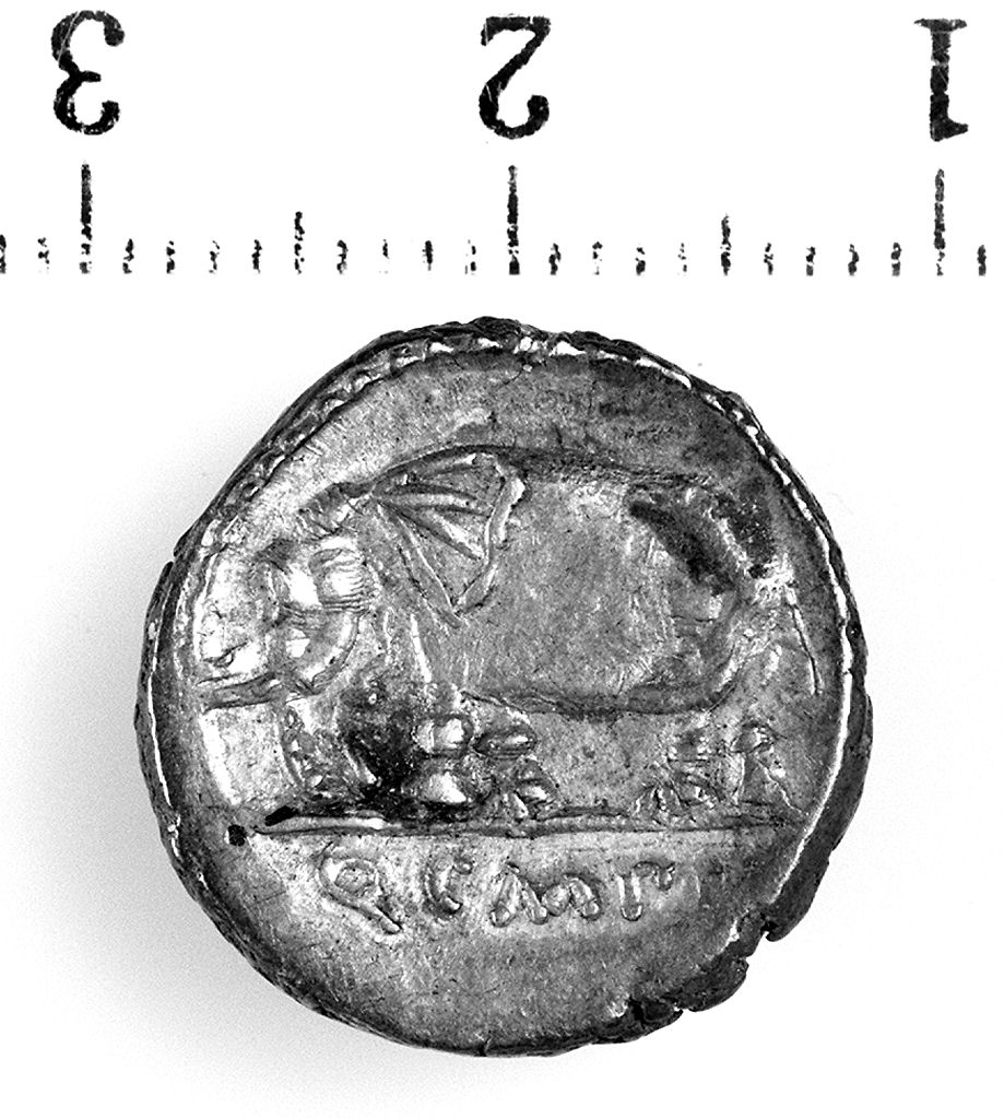 D/ Testa della Pietà con diadema a d.; davanti: cicogna. R/ Elefante a s.con campana